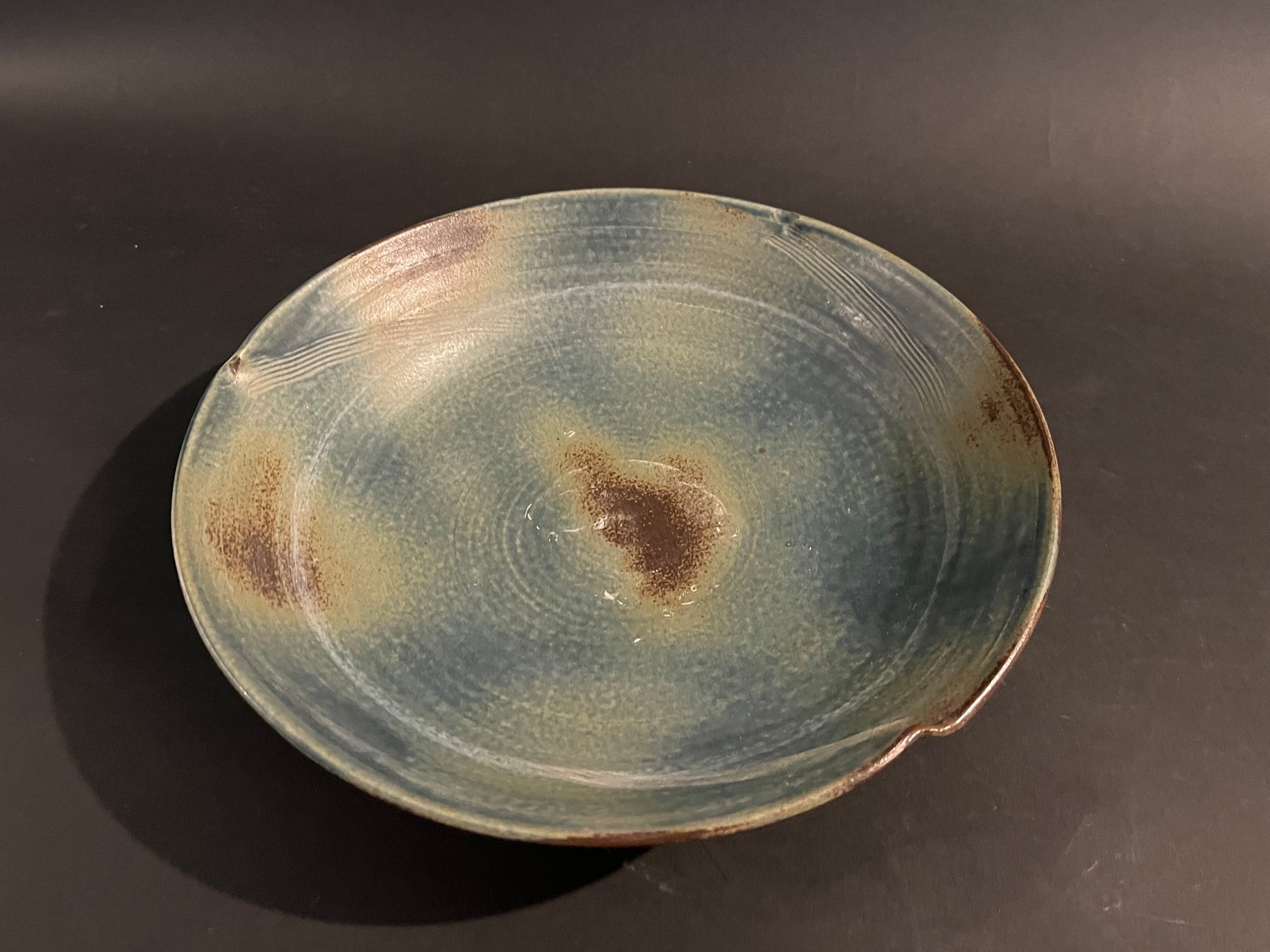 Shallow, round ceramic ikebana vase with a blue-green glaze with splashes of brown. The rim is slightly indented, and the interior features a carved striped design radiating from the indentations.