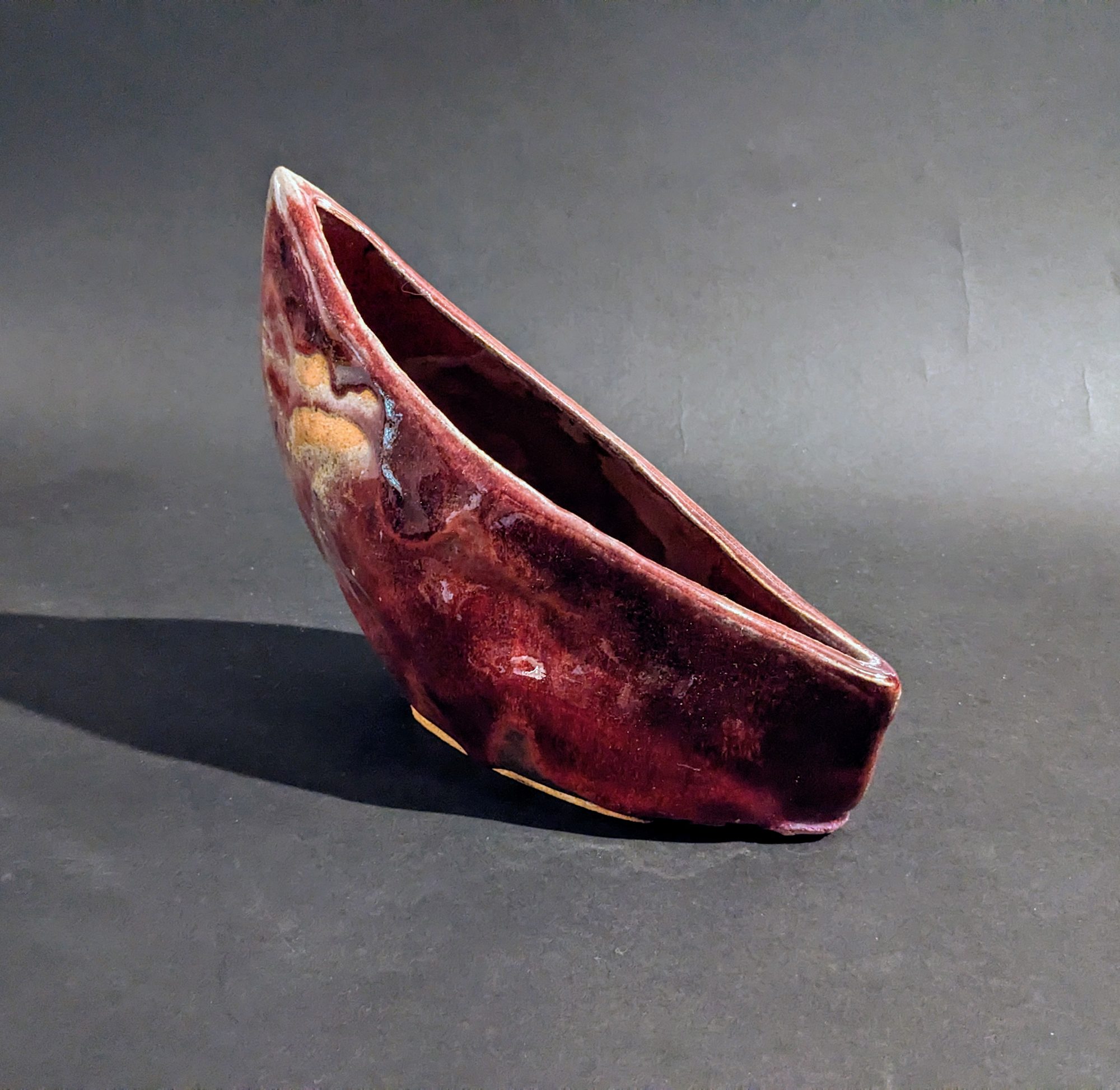 Small, narrow vase of semicircular form, asymmetrical with one side longer than the other. Covered in a dark red glaze.