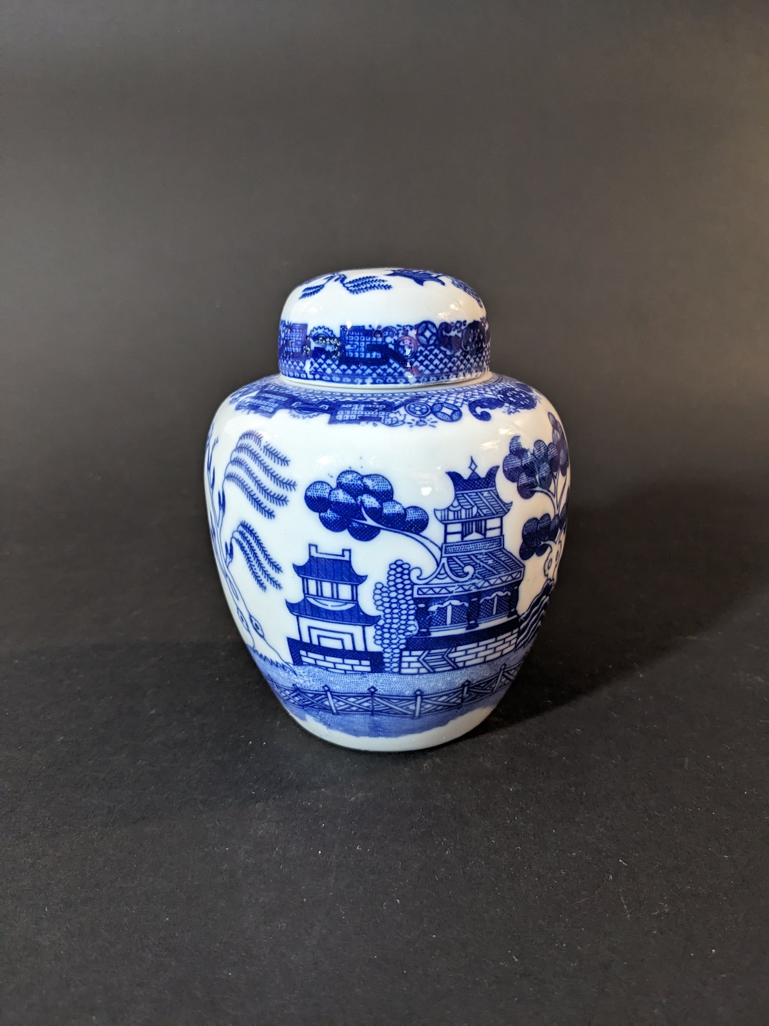 Small decorative porcelain vase with cover, decorated in blue with pagodas and stylized trees.