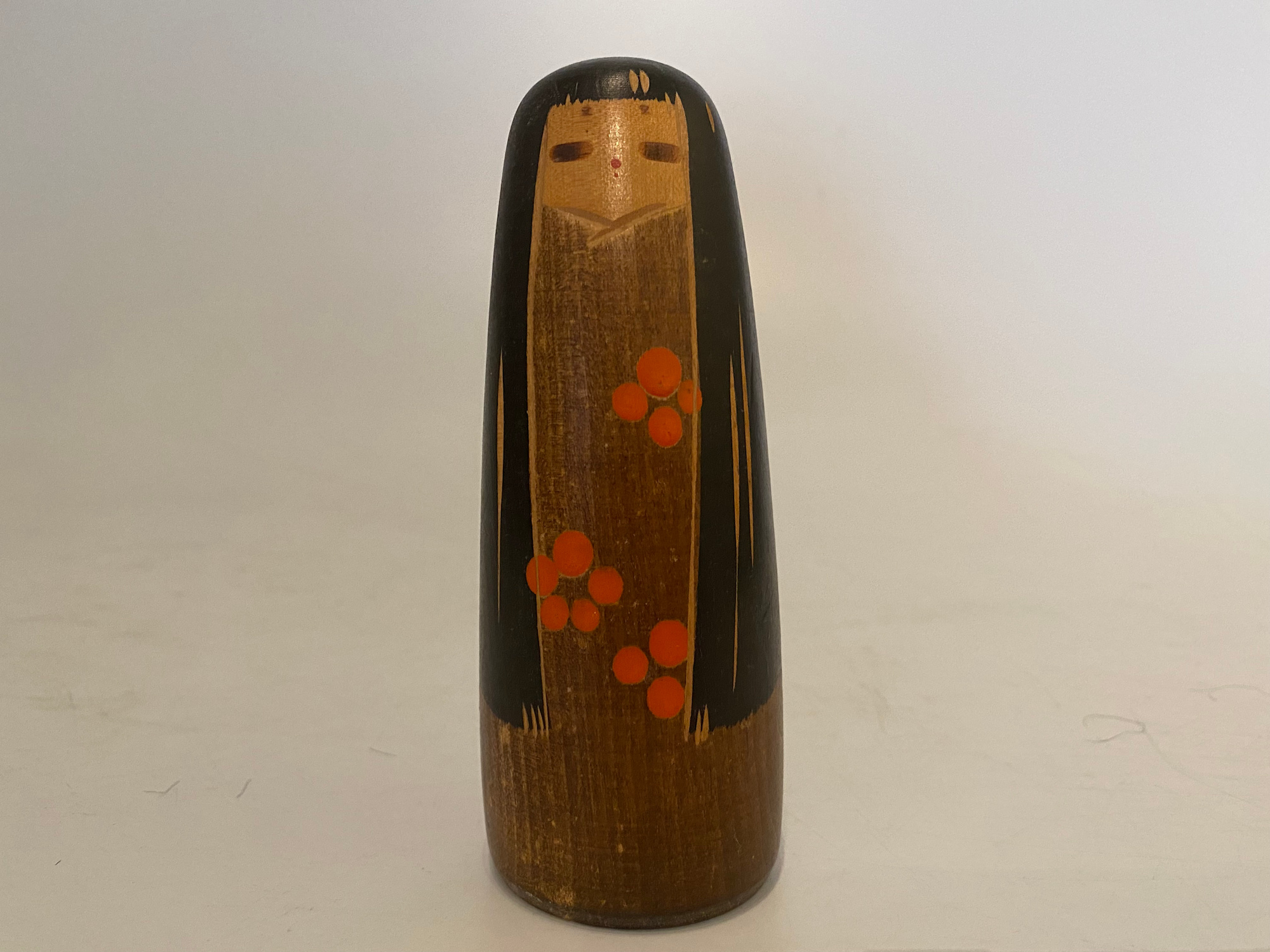 Carved from a single piece of seasoned wood, this doll exemplifies the sōsaku tradition, which emerged in mid-20th-century Japan as an artistic departure from the standardized forms of traditional kokeshi. Unlike their folk counterparts—typically produced in specific regional styles—sōsaku kokeshi are the expressive works of individual artists, often signed, and intended as decorative or contemplative objects rather than children’s toys. The figure’s minimalist form is offset by hand-painted features that convey a quiet introspection, characteristic of postwar aesthetics. The smooth, lathe-turned silhouette and the subtle play of natural wood grain speak to both modernist sensibilities and enduring Japanese reverence for organic materials.