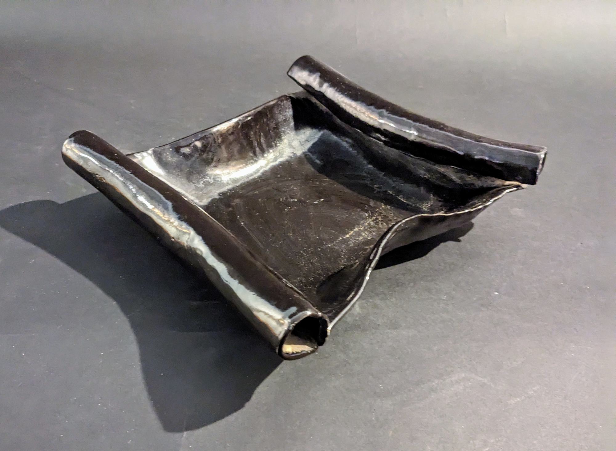 A shallow, square, black ikebana vase featuring two curled edges.