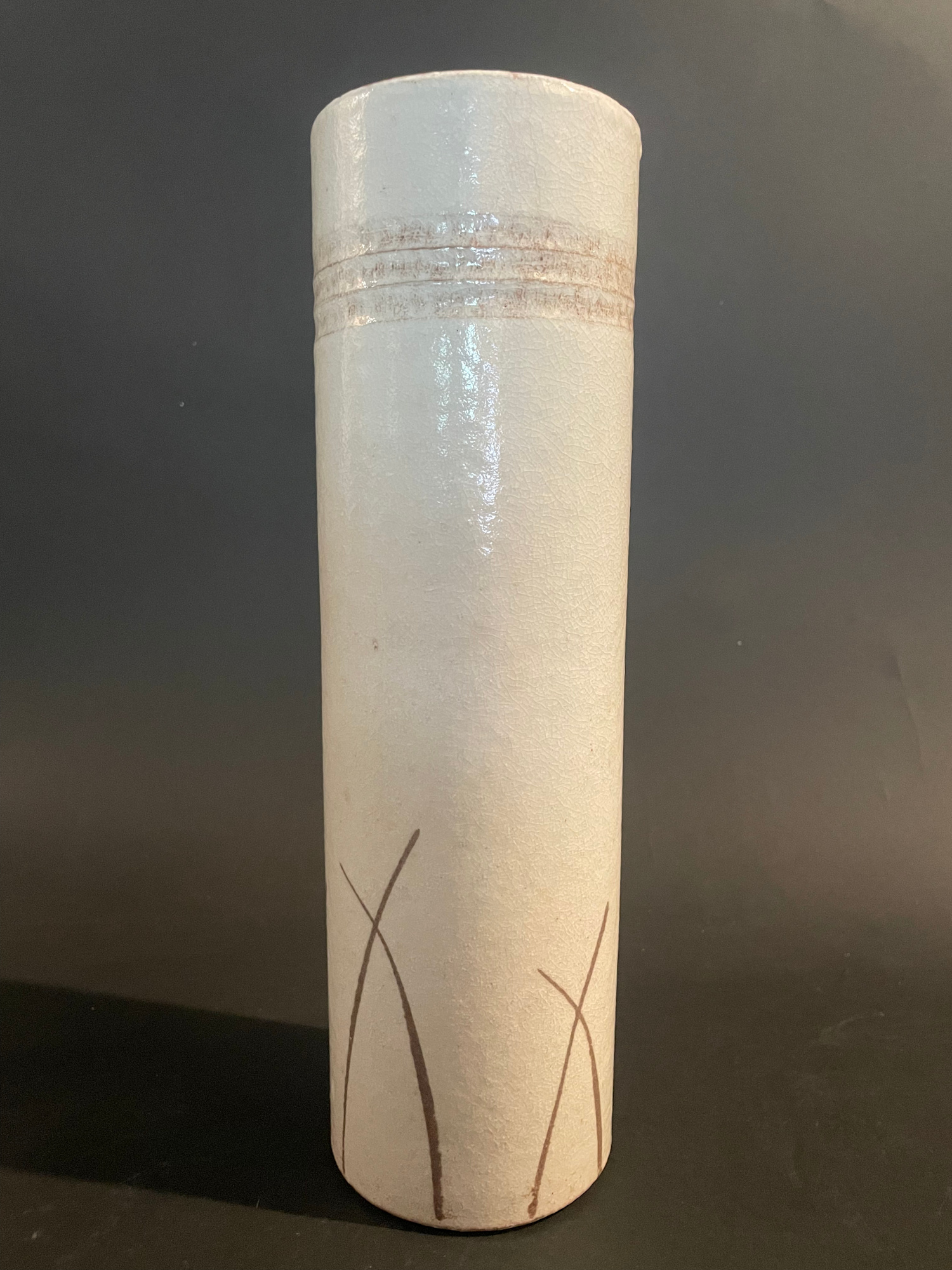 Tall, cylindrical white ceramic ikebana vase for nageire arrangements, featuring a brown grass motif accenting the base.