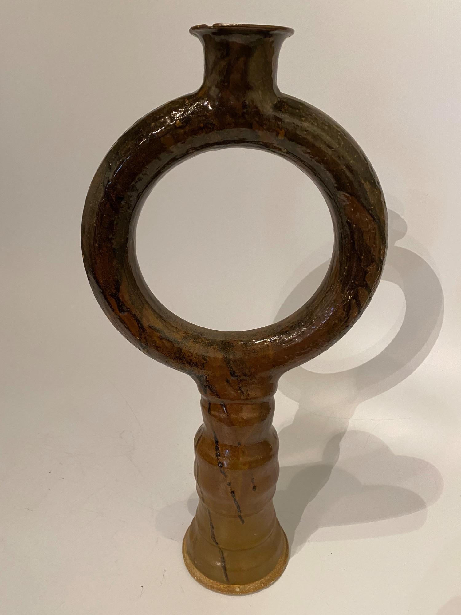 Tall brown ceramic ikebana vase featuring a tubular foot, a central ring, and a tubular neck.