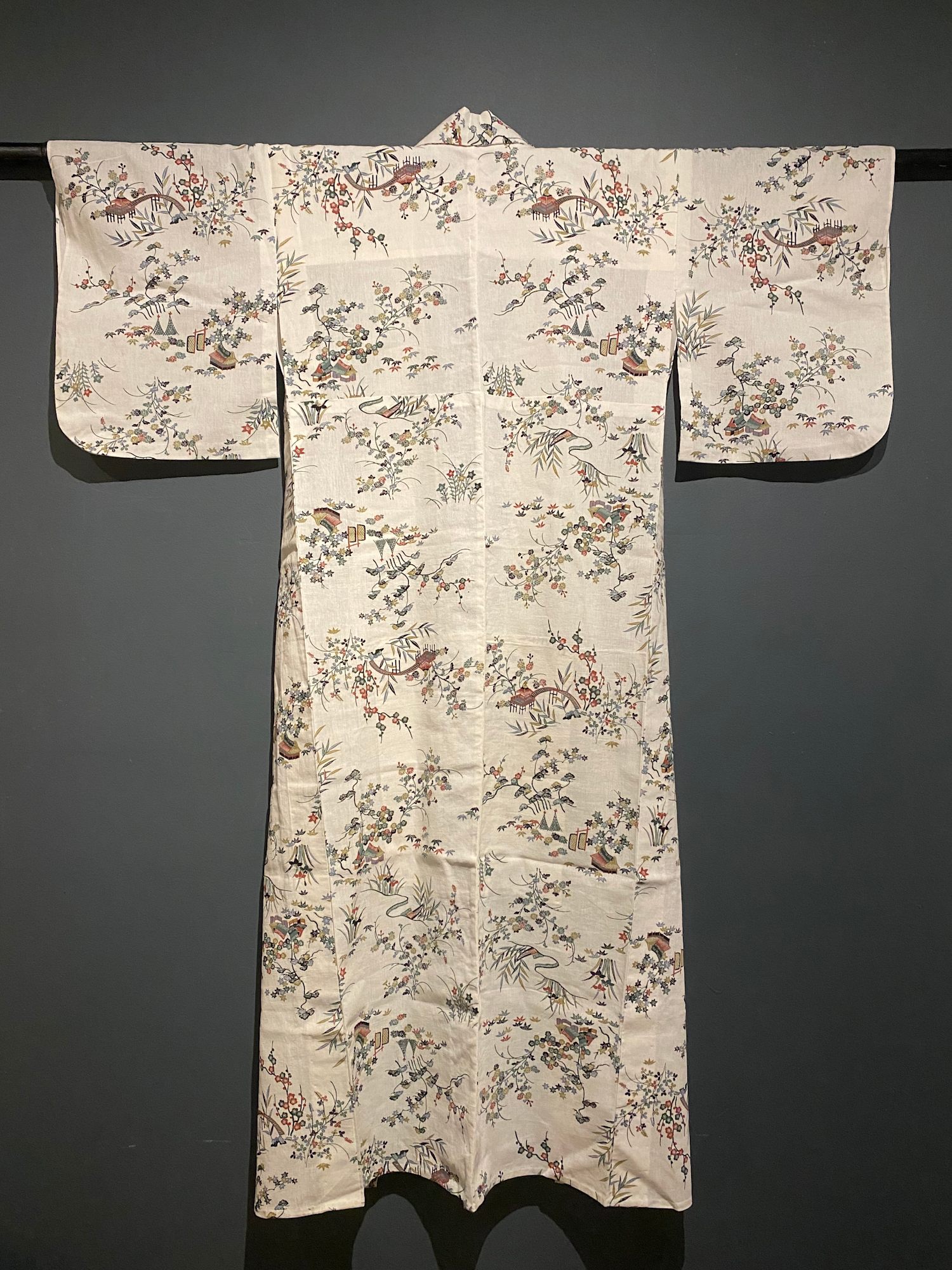 Yukata (浴衣), casual summer kimono in cotton, animated by vignettes of Japanese gardens - pavilions and fences, flowering plants, pines, maples, and bamboo.