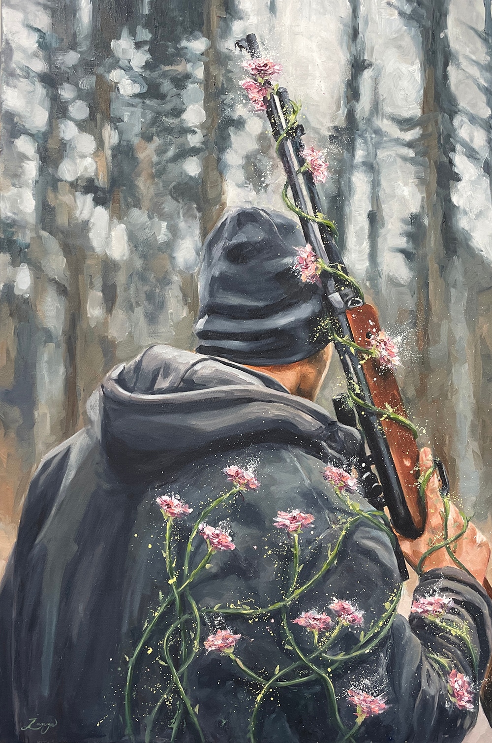 Imagining the quiet force of nature peacefully disarming destructive human tendencies. Bullets cause a spray of blood as they take life. Flowers produce a spray of pollen to create life.