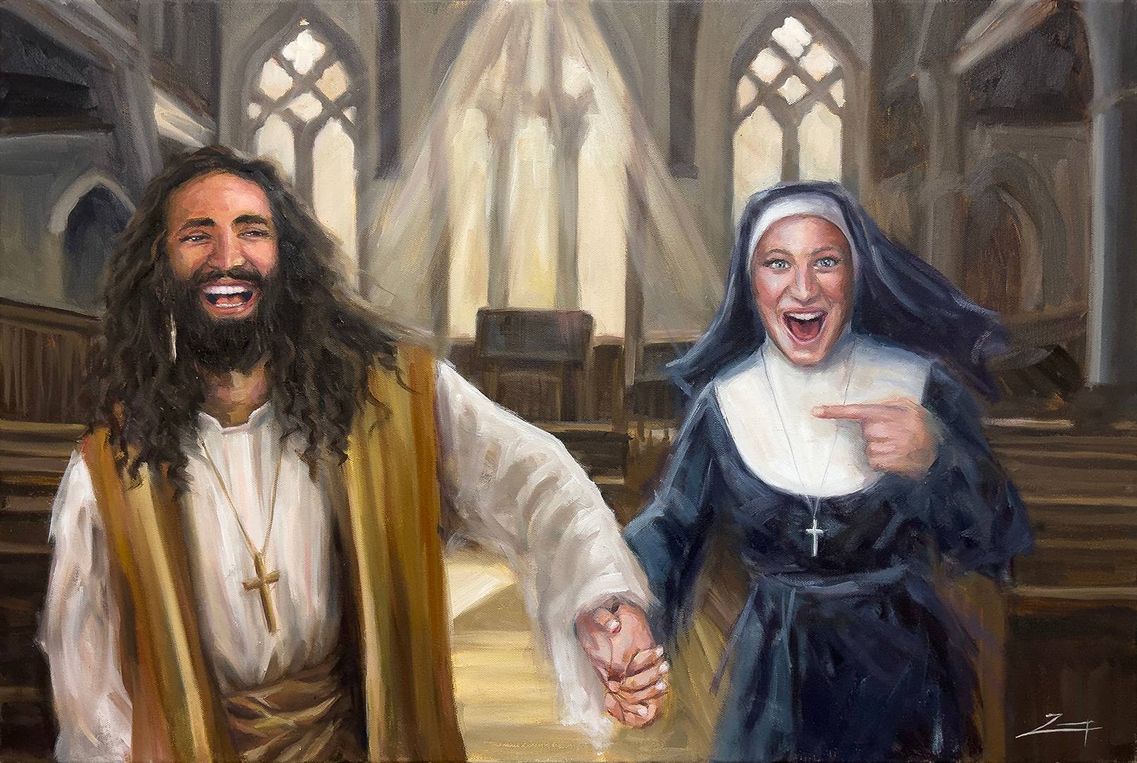 I’m not religious, so nuns have always seemed like distant figures to me. However, I’m intrigued by the concept of a nun’s Perpetual Vows—where she dedicates her heart and soul to Jesus, becoming His Bride for life. There’s something compelling about a marriage commitment to a conceptual being rather than a physical being. For fun, I decided to paint this feeling of joy and also paint Jesus as quite the catch. I imagined a Sister enthusiastically embracing a lifelong dedication to this dream Husband, known to radiate and inspire goodness.