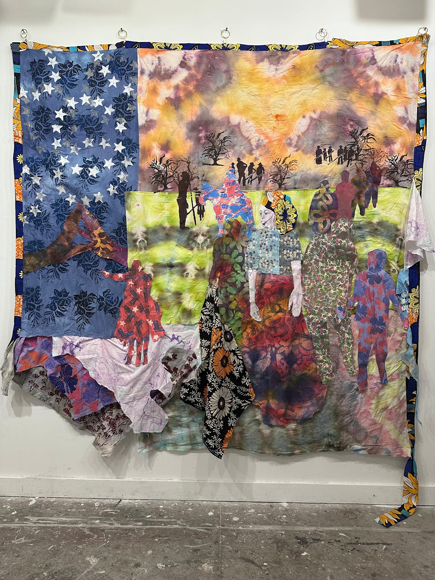 I employ various hand-dying and printmaking methods to create images that examine the history of American labor practices and their impact on Black bodies over time, rendered on a range of textile fabrics and multiple types of paper. I’m interested in the way a printed image can activate a space. Each of the images is connected to an agreed-upon historical symbol or item related to Black historical lexicons. The foundation of my textiles is the plants. Florals used in companion growing, crops that have historically been crucial to Black Americans for food, healthcare, and self-defense, were often plants used against those seeking freedom. These plants and animals helped enslaved people earn money to buy property and liberty while also serving as witnesses to history, forming the foundation of each fabric. But overlaid on that history are also images of historical racism, such as Klan members or a lynched family. These items contribute to continued labor oppression through the prison industrial complex, including weapons, drugs, and items that poison our community, like alcohol.