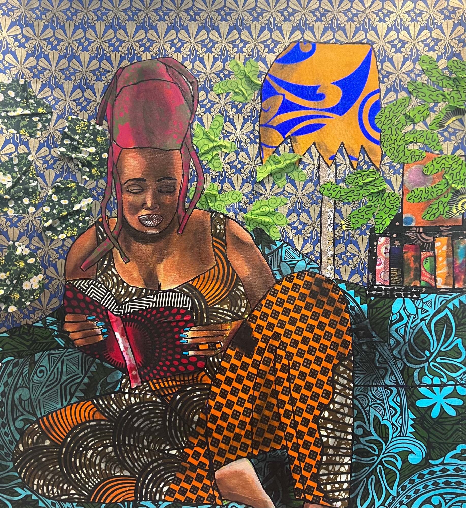 My works are collage tapestries meant to be in conversation with the cultural practice of hand-assembled artworks. From the rich culture of the Gullah Geechee to Harriet Tubman to Louis Armstrong, assemblage has been a powerful means by which Black stories are told and passed down over time. Through critical fabulation, the physical pieces seek to exist as historical items telling untold stories of Black rest.