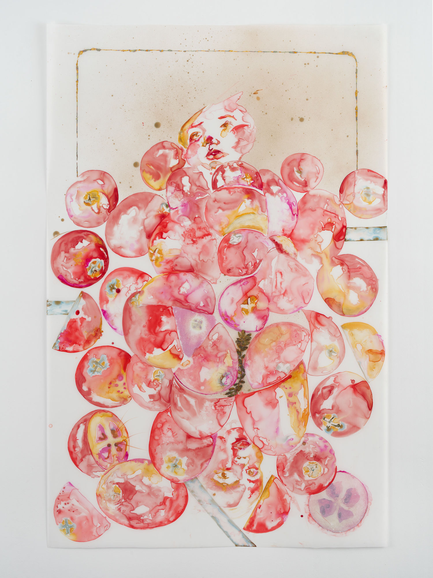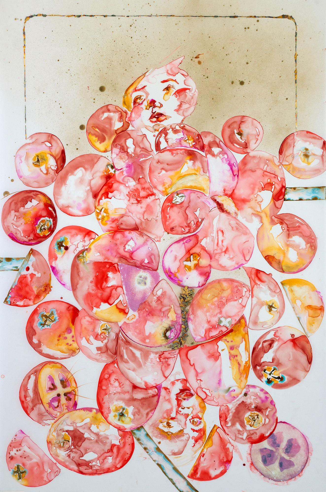 This image was inspired by the IVF process and the multiplying of cells in an embryo just after an ovum is fertilized. The orb-like shapes reference the fruit of my upbringing, having grown up on a cranberry farm, and even include photographic image transfers of fruit from my family’s farm. This nod to agricultural fertility is likened to the fertility of the female body here.