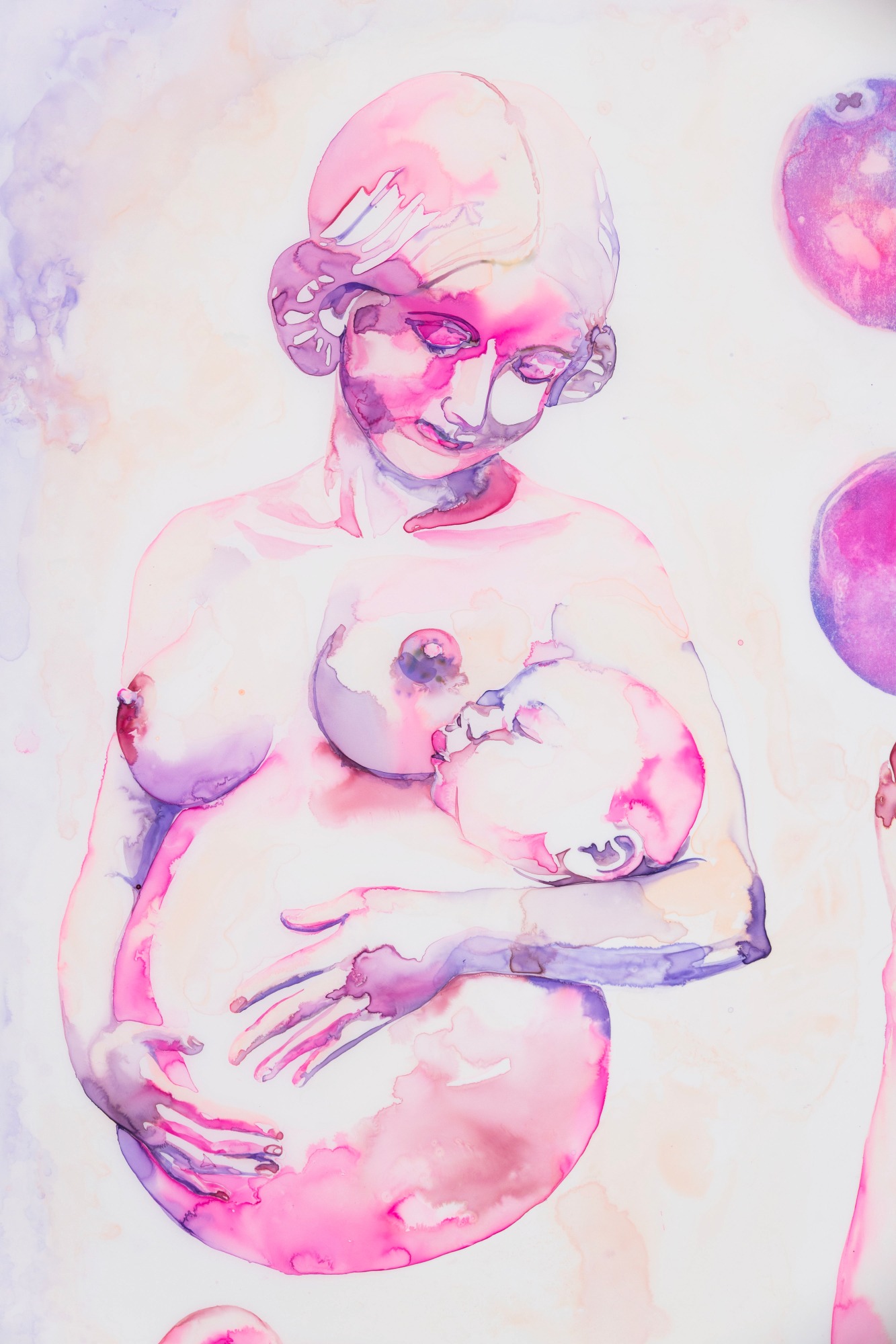 I paint the female body in states of transformation—pregnancy, birth, postpartum—to reveal the visceral realities of motherhood. I want to know how this experience consumes, ruptures, and remakes the self. I’m drawn to the monstrous feminine—the reproductive body as both feared and revered, vola
