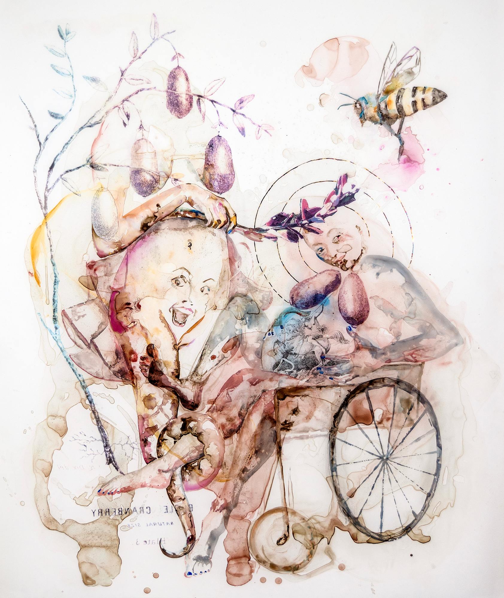 This composition swirls together allusions to the Madonna, to Baubo (a face-crotched figure of jest and seduction in Greek mythology), to the serpent, and to more agricultural elements of a pollinating bee and historic botanical illustrations of cranberries. The illustration is an image transfer of the oddly shaped breed of cranberry, the “Bugle Cranberry,” sourced from the first-ever publication about cranberry cultivation from the 1800s.