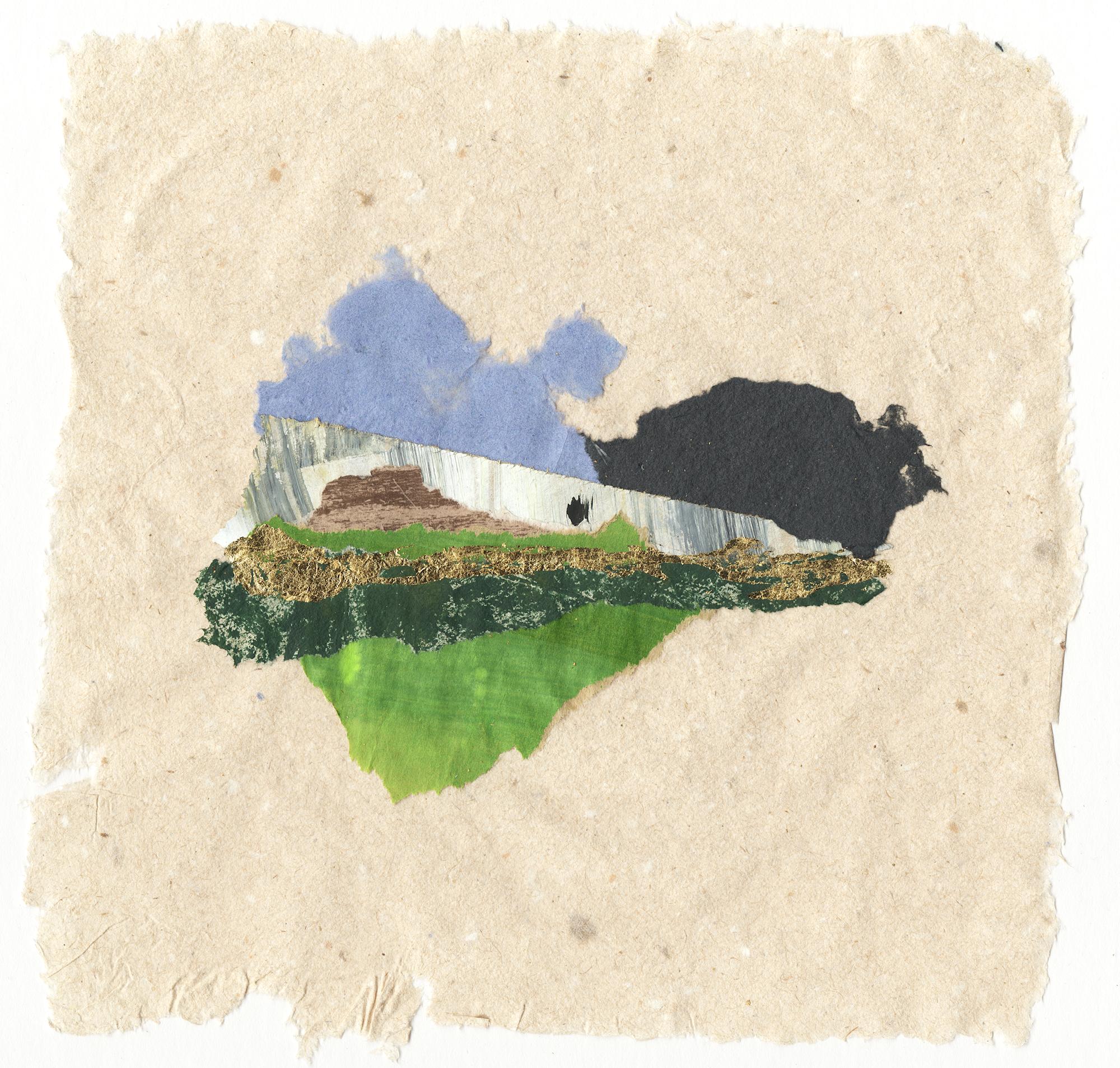 An abstract landscape on paper inspired by Ward Pound Ridge Reservation in Westchester, New York. Created with alternative photographic processes, handmade papers, photographs, paint, and gold leaf. Framed in a natural wood frame with TruView Conservation Clear glass and archival materials.