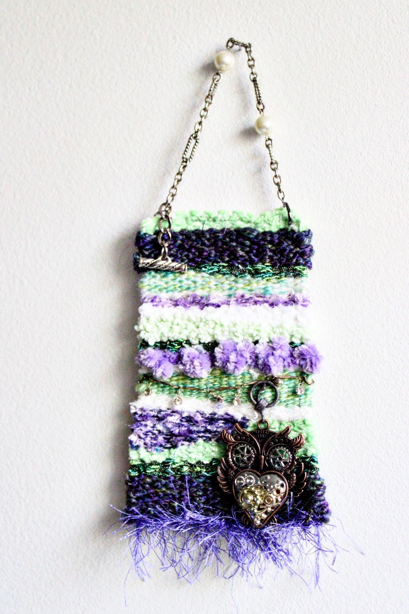 These creative pieces are hand woven on an old fashion metal loom. Yarns are a variety of material, mostly unique one of a kind. Many will have yarns of cotton, wool, linen, mohair, faux furs, string yarns, flag yarn, ladder, ribbon, silks, rayon, polyester, velvet, chenille and anything unusual. Everything goes through a rigorous cleaning, winding into a ball, color sorted and showcase unusual yarns to become the centerpiece of a new tapestry. Jewelry pieces are found treasures that often are the inspiration for the tapestry. You may find a bracelet, pieces of jewelry taken apart and reworked, pin or a whimsical accent all of high grade vintage jewelry. Items are cleaned with alcohol and refurbished to sparkle and enliven these works of art. Many will often have swarvski crystals added into these works of art. Hanger is A large metal link necklace (recommend using a decorative nail to hang as shown - these are not included) that finishes the artwork for unique display.
