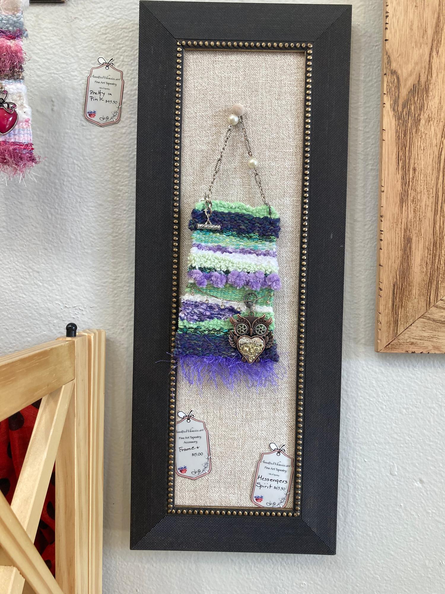 Owls are messengers and seekers of truth where one can always find wisdom in silence. This intriguing hand woven tapestry whispers to those who listen. With a background of unique yarns that include a popcorn chenille, ladder string, delicate chenille, flag string, cotton, delicate eyelash and specialty yarns this owl fascinates all. A dangling string of crystal jewelry adds sparkle, while an unusual bracelet is the hanger. A truly unique mini fiber art tapestry.