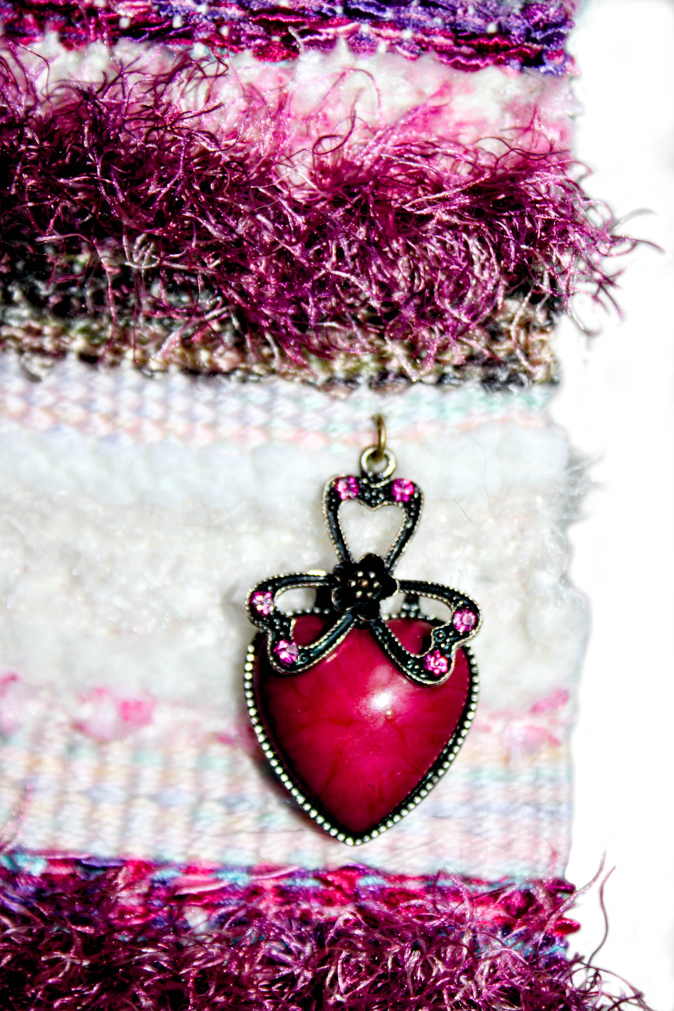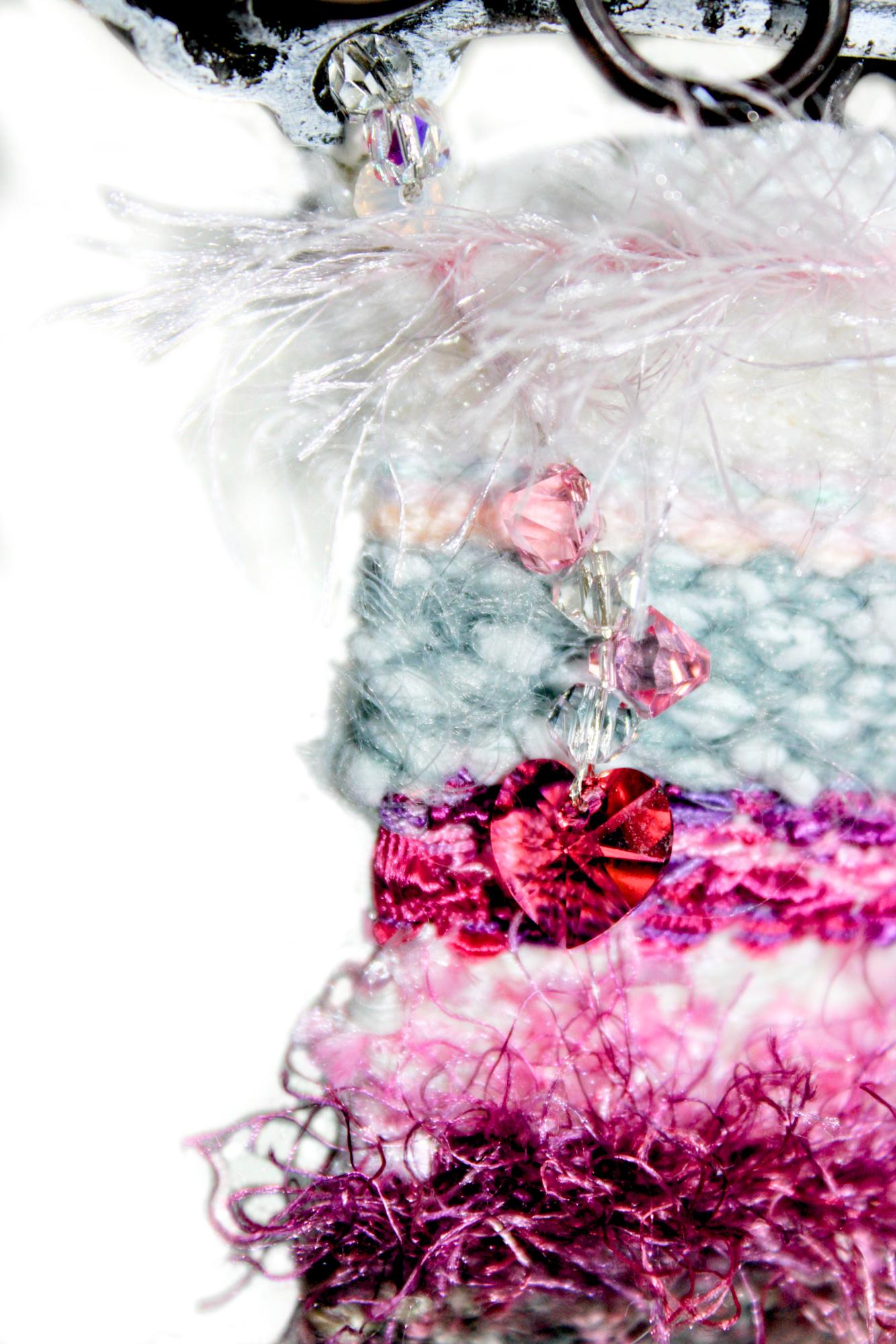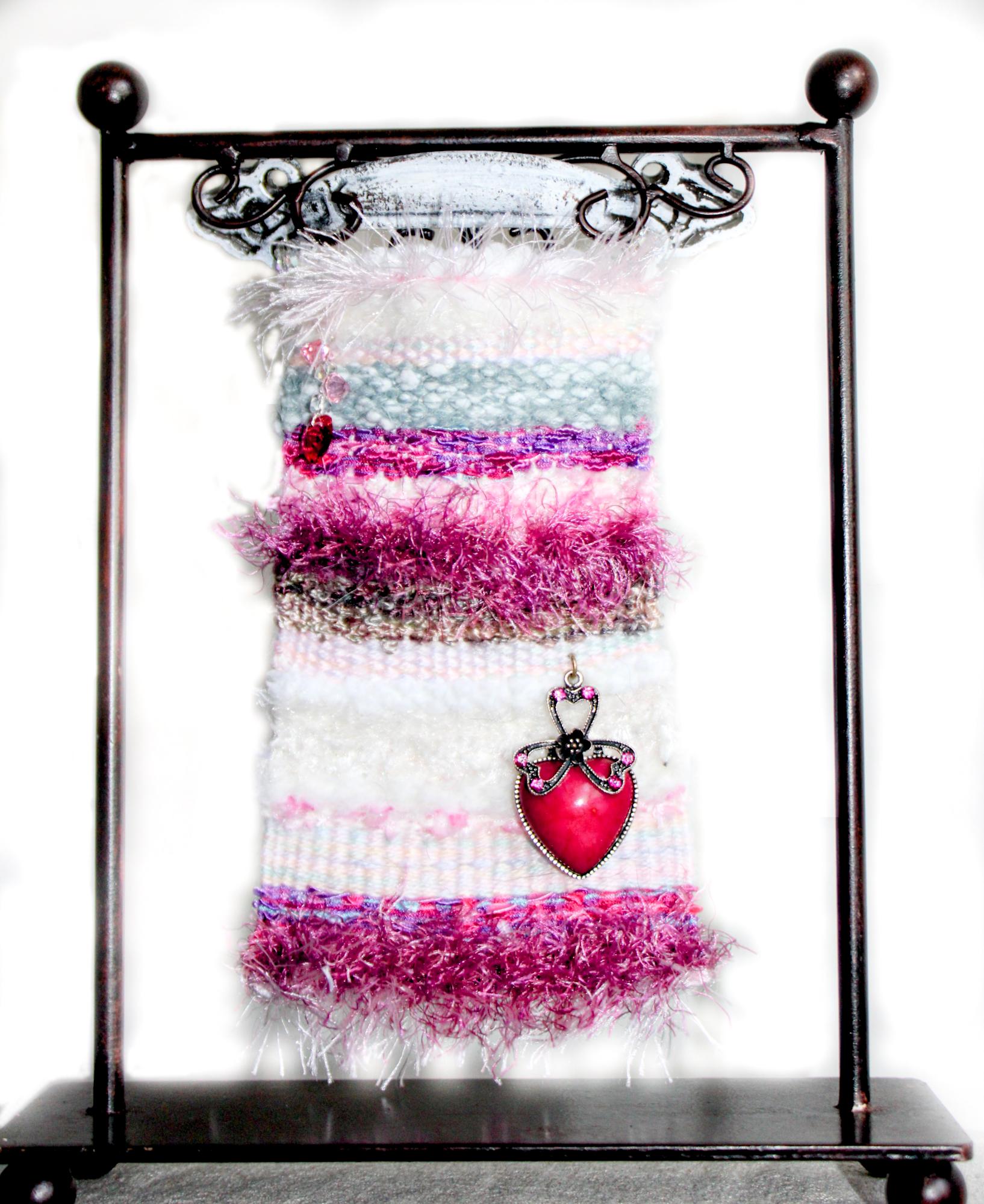 Pretty in Pink Art Tapestry is just under 4" wide x 7" long including the white painted metal handle hanger. The tapestry is accented wth a unique heart trimmed in antiqued silver metal with pink crystal accents. Plus swxxski crystal (can no longer advertise these by name) heart and dangles in upper corner to make this art piece sparkle. This tapestry was created with a unique silky soft fur, cotton, shimmery cream, ladder yarn, eyelash and chenille. A true show stopper for all those pink girls! Easy to hang with a decorative nail (not included).