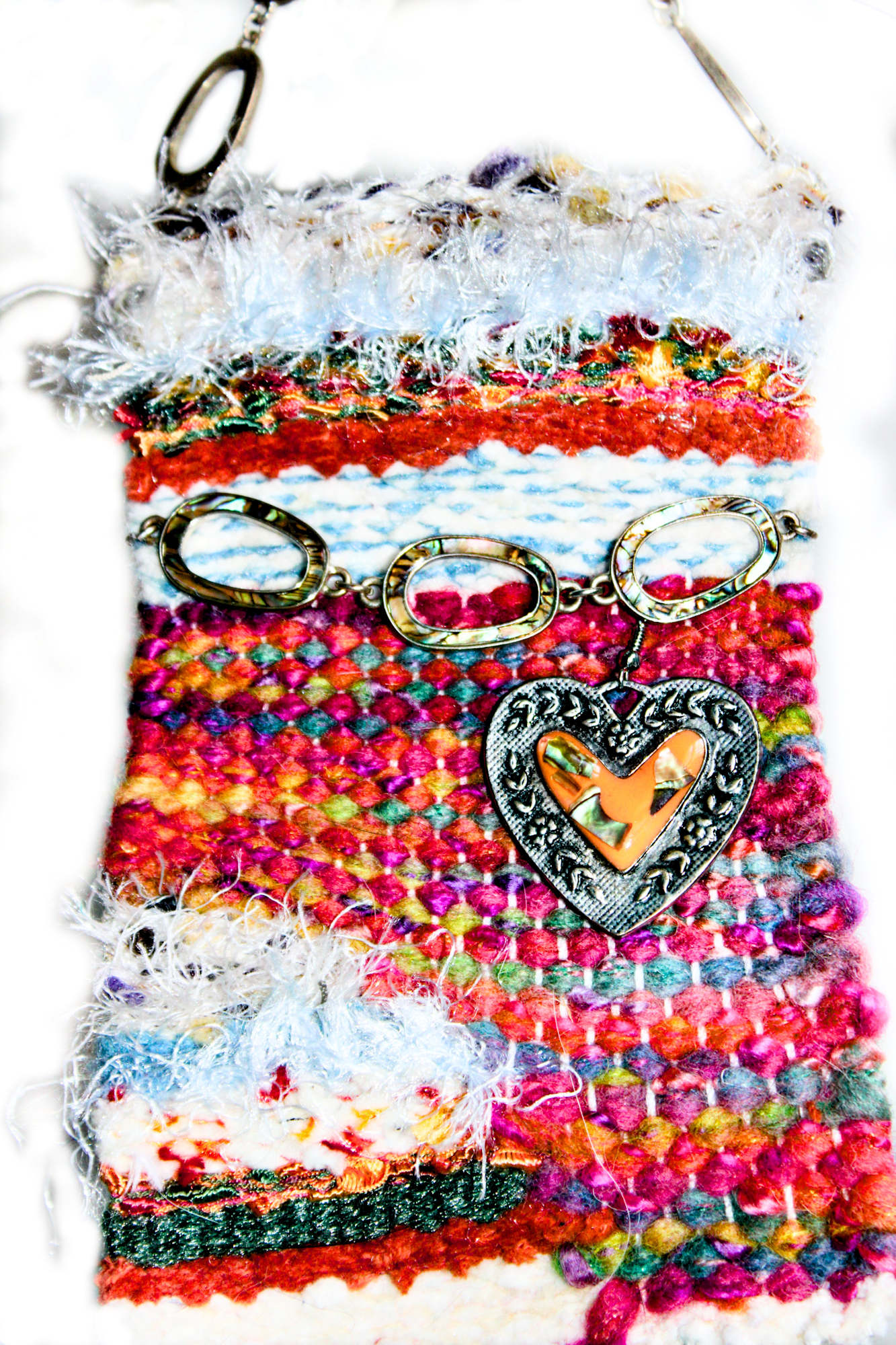 Mini fiber art tapestry created with found fibers and jewelry treasures from a non profit that supports the developmentally & intellectually challenged. Support a cause with your purchase created in the USA.