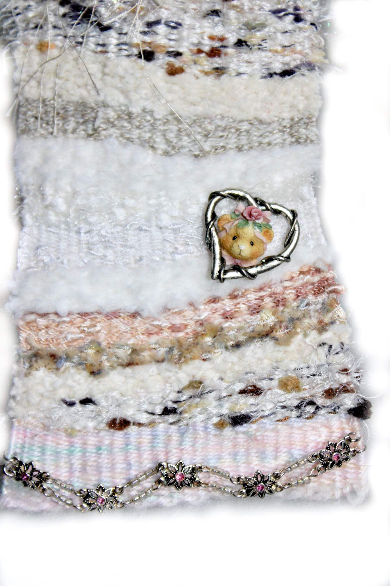 There are some things vintage that never should be lost. Teddy Bear collections have been a part of my life since I turned 16. I even built a wall shadow box to house my stuffed bears. Vintage Dreams is to honor those who love bears like I do. This lovely twined metal heart with a resin Bear added inside. Both are parts from jewelry pieces that sold new for over $25 apiece. Tapestry is trimmed with a beautiful pink and silver colored bracelet. Tapesty is 4" wide x 8" long including the hanger. Hanger is a dusted cream metal drawer pull that offers a unique topping to this unusual tapestry. Created with fuzzy solft cream chenille, popcorn fur, cotton string, linen, feather, ladder and schimmery string yarns - all repurposed yarns.