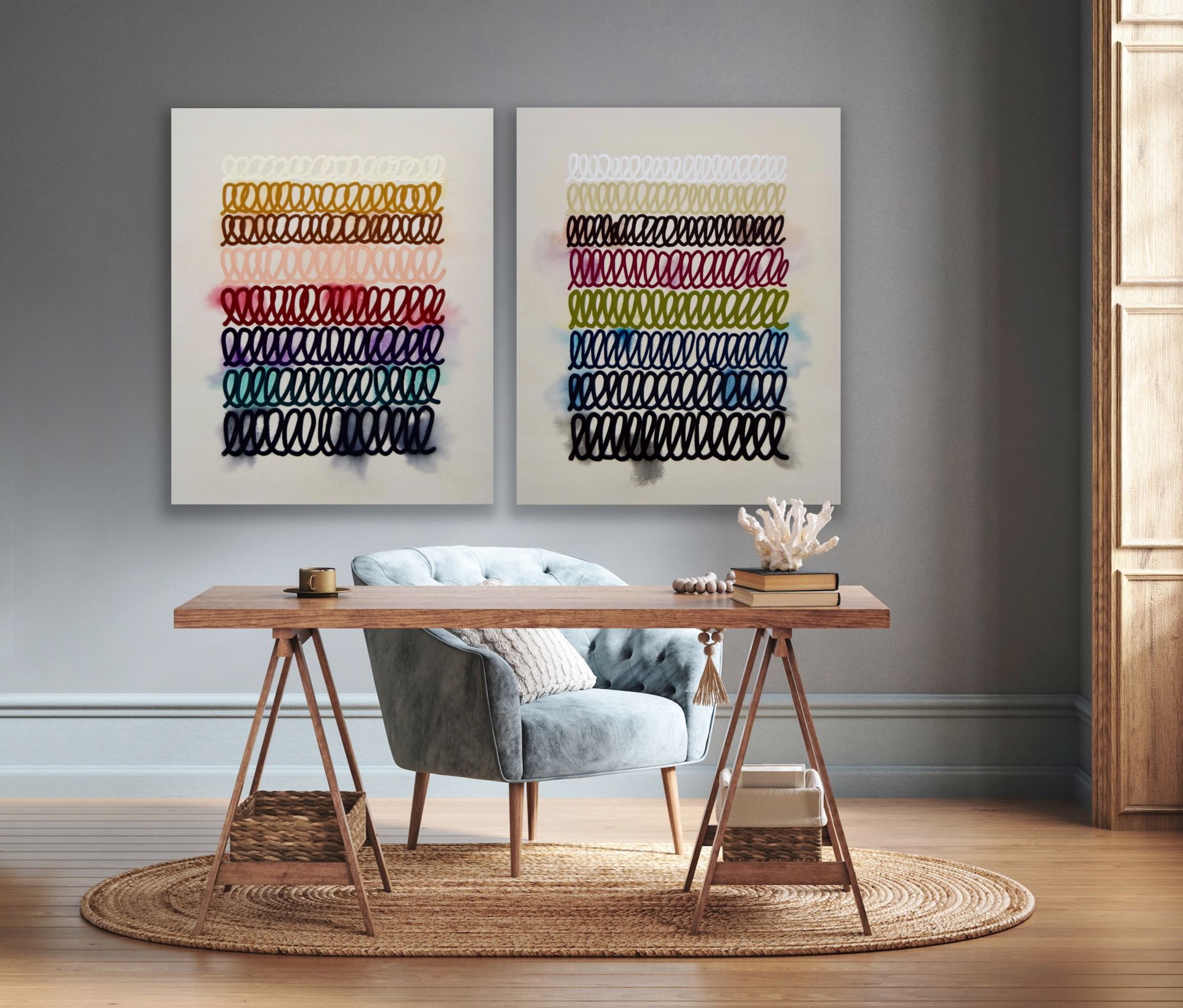 This new series, created with oil and acrylic paints, is dedicated to pure color, applied intuitively and freely. The colors are painted in thick strokes on raw, unprimed cotton canvas, creating lively swirls and flowing lines. The paintings are free and spontaneous, leaving behind the rigid fo... more