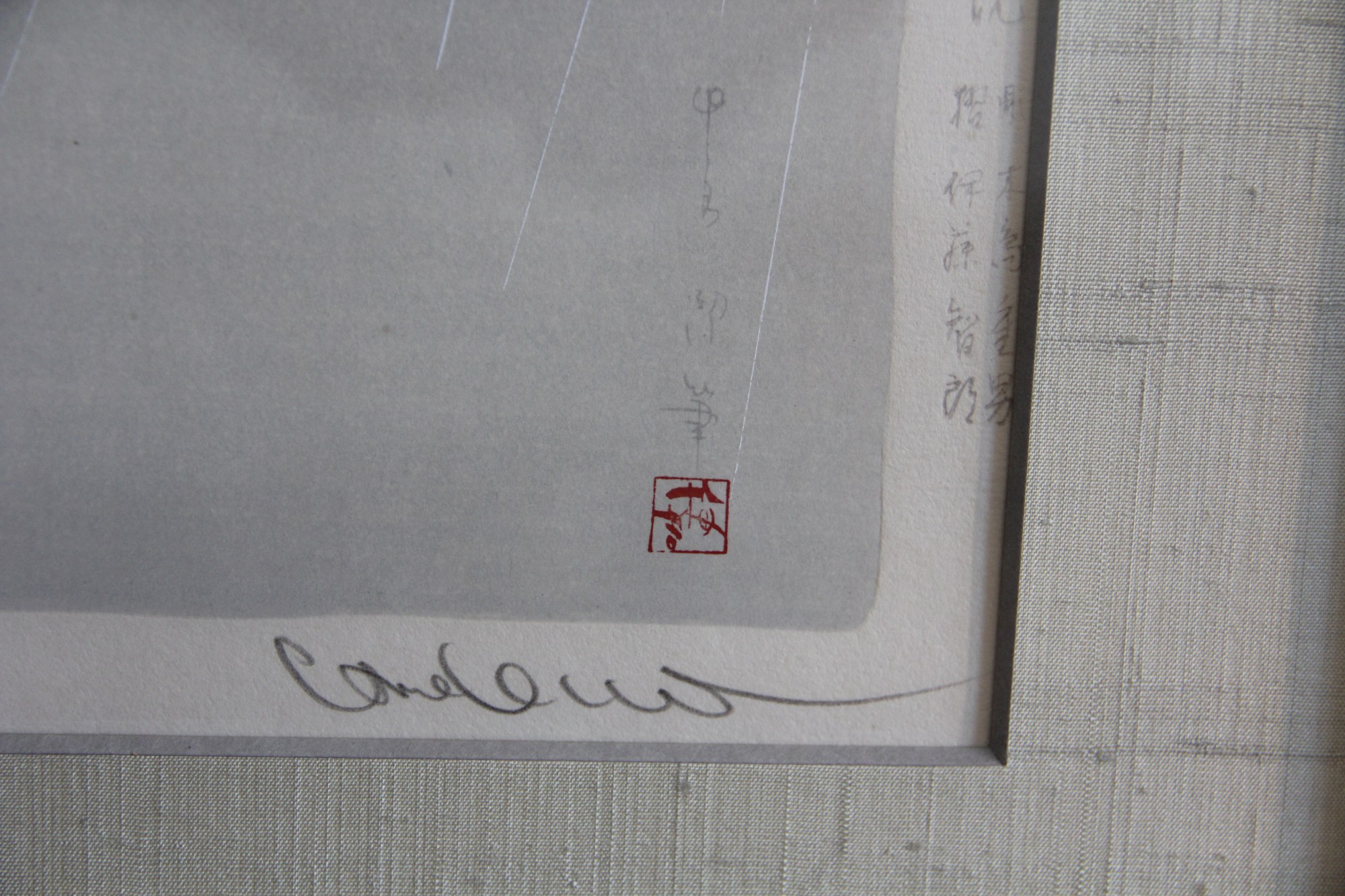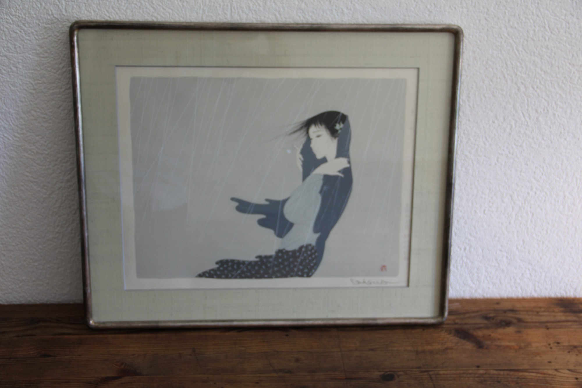woodblock print in simili-antique frame with silver/gold patina and rounded corners (mfctd. by Kato frame making, Tokyo)