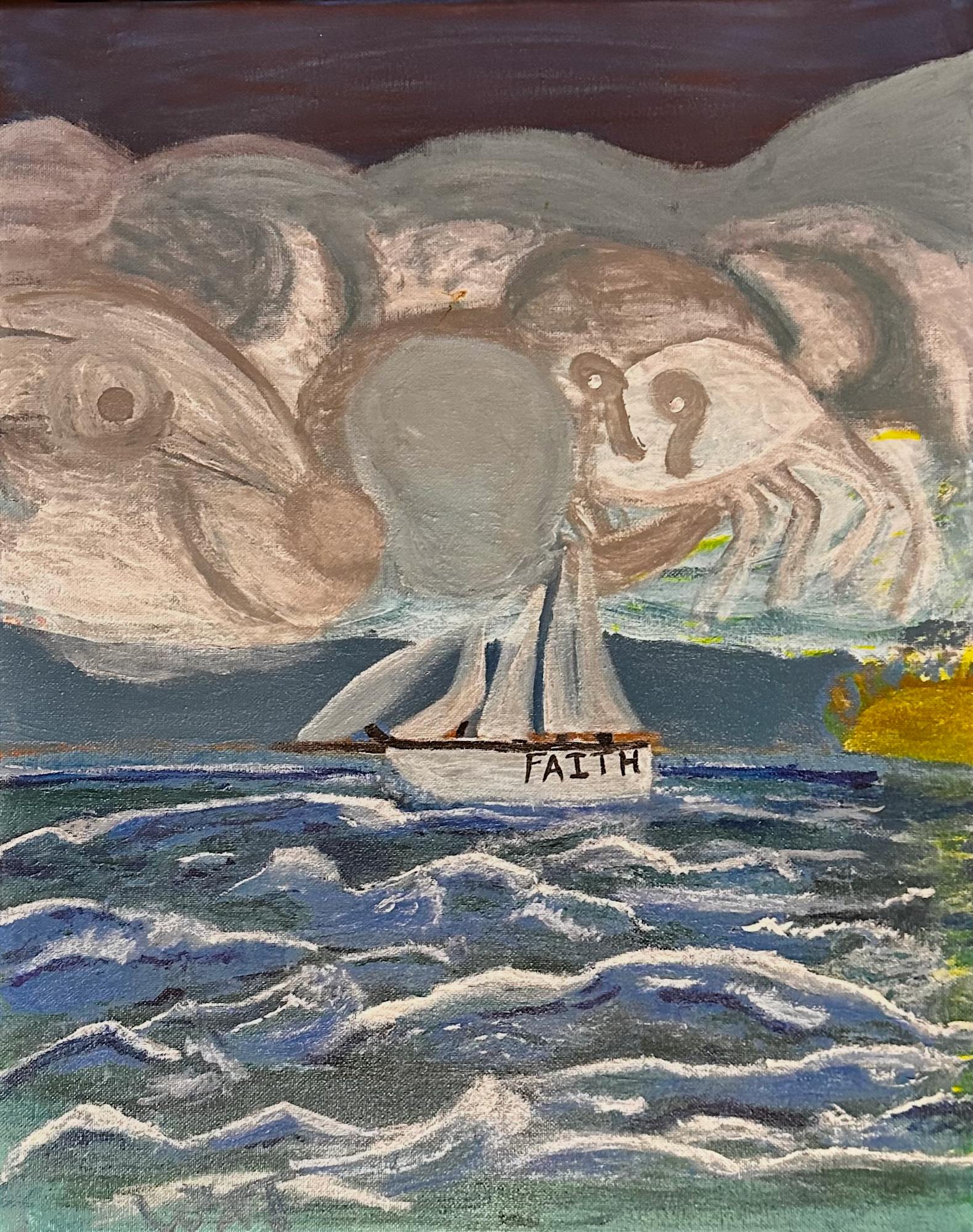 Created in honor of my father's journey of resilience, Faith Boat portrays a sailboat navigating turbulent waves at sunset. Above the ocean, the clouds form a playful animal figure accompanied by a crab, watching over the scene with gentle humor. The painting blends struggle and joy, reflecting both the power of the sea and the strength of spirit my father showed when he lost the ability to walk and, through determination, learned to walk again. It is a tribute to perseverance, faith, and the hidden wonders that guide us through life's storms.