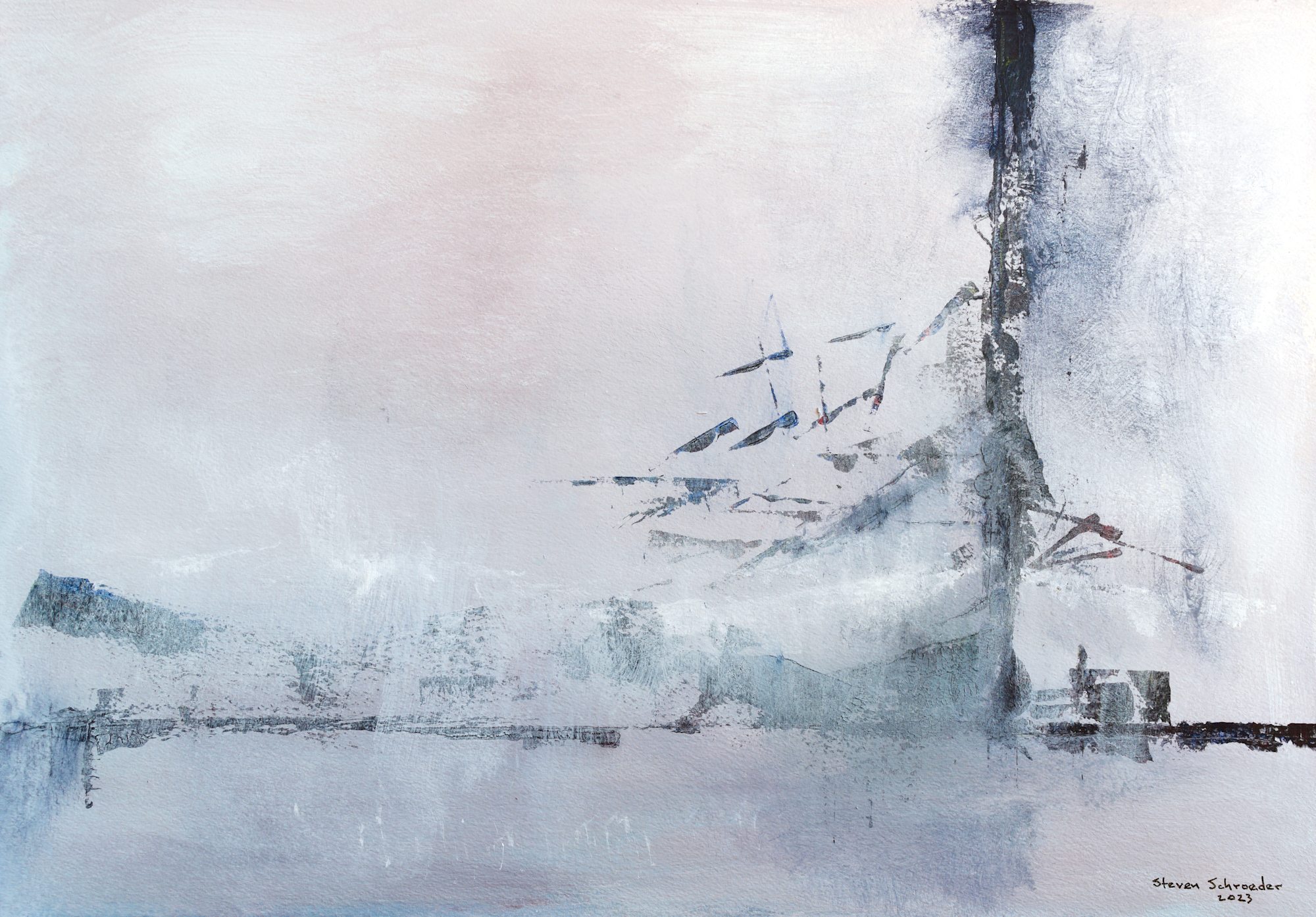The snow has mostly melted quickly this winter (2022-2023) and served as a vehicle for the chalk white salt on gray and gray brown surfaces broken at intervals by straight lines (gaps between paving stones and expansion joints in sidewalks) and by cracks and fissures formed (in spite of the gaps) with variations in temperature. The resulting patterns often make me think of landscape paintings done with ink and brush on rice paper, created as much by water carrying ink across the surface of the paper and the paper absorbing it as by the artist holding the brush. This piece is the second in a series playing with that process using water media (acrylic in this case) on paper.