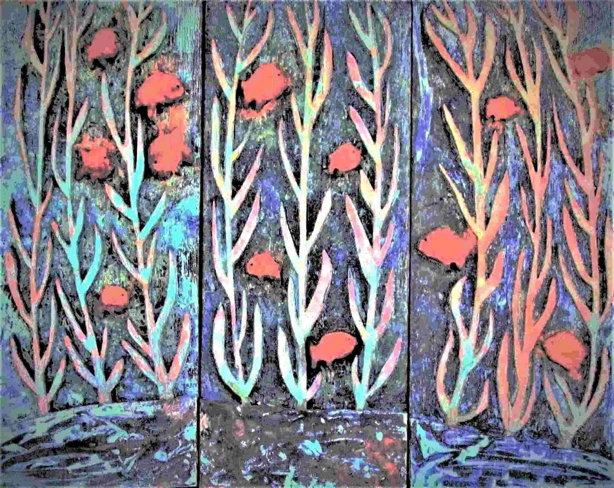 The composition pulses with energy, as if the entire marine scene is swaying to a jazz-infused melody beneath the surface. Layered textures and vivid hues of aqua, indigo, and coral create depth and movement, capturing the buoyant grace of life beneath patina in subtle shades of brown, green blue. Painstakingly chiseled by hand