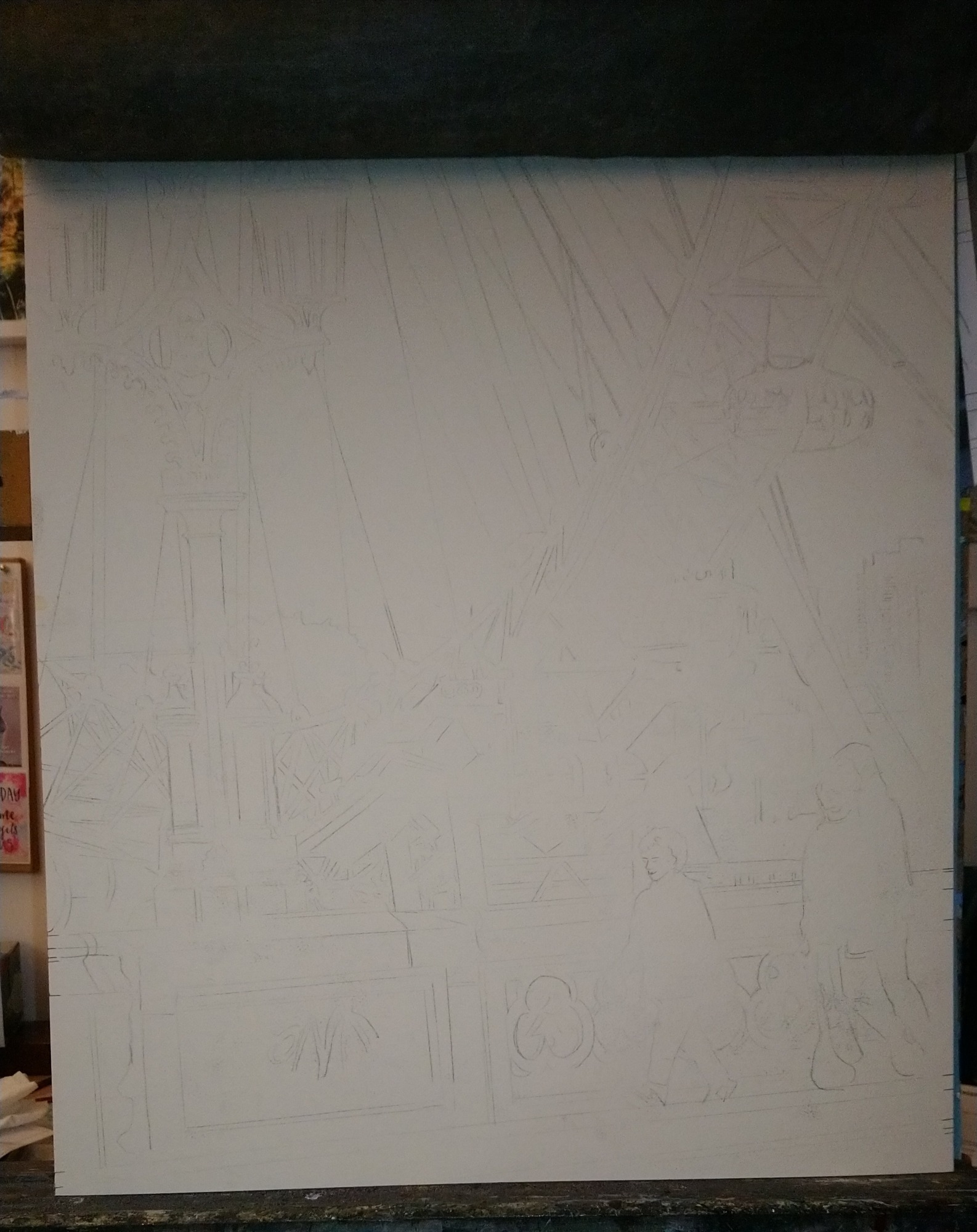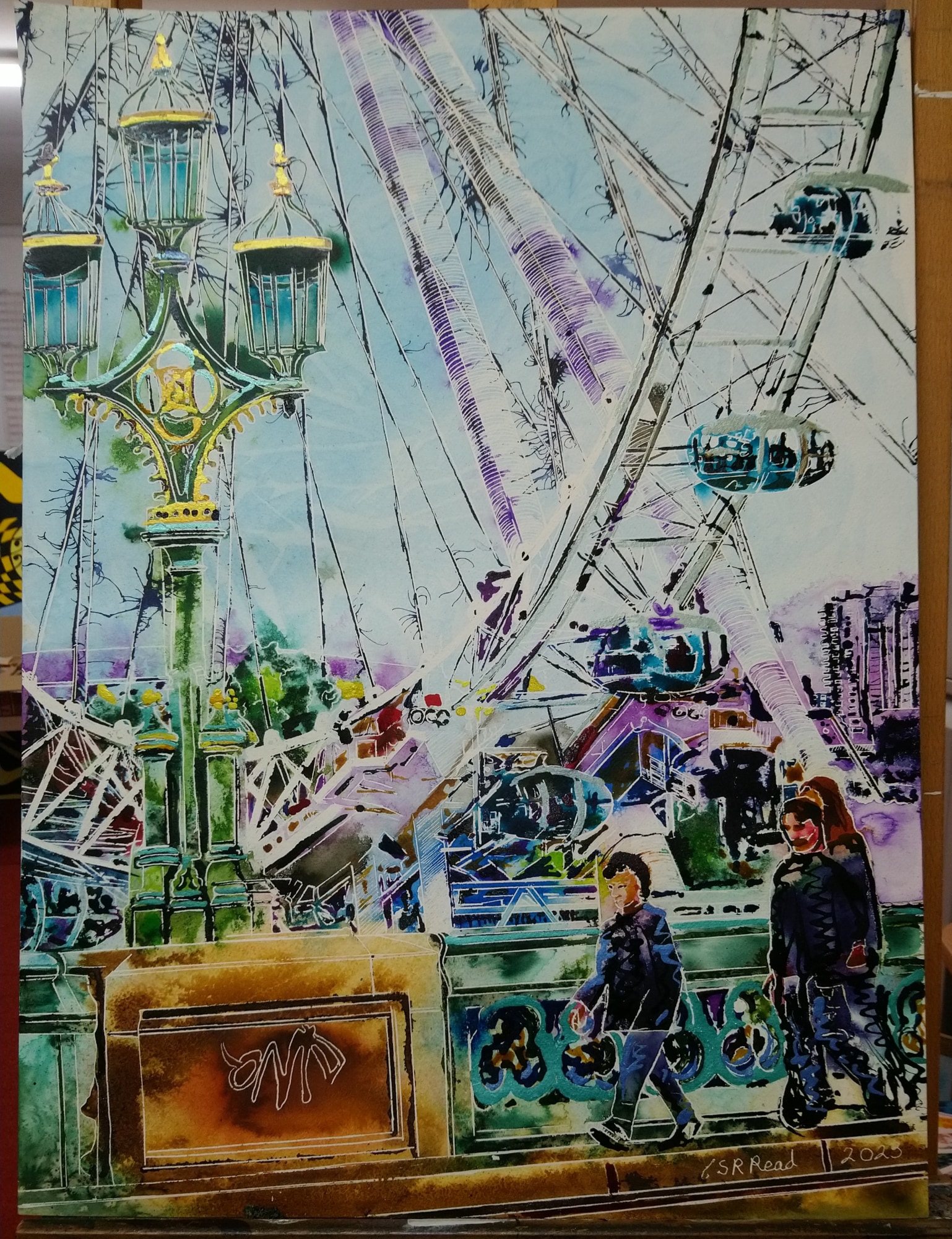 The four clubs are on the railing or wall of the bridge behind the three solid figures, with a determined appearance. Oblivious to the beauty of the surrounding scene. The lamp post draws your attention, set at the heart of a Ferris Wheel halo. Three gemstones set in gold with all the details that you could imagine. Over the top comes to mind. More Victorian excess they didn’t do lights. They did lights with knobs on literally. I wonder if that’s where the phrase originates, I must go and find out.