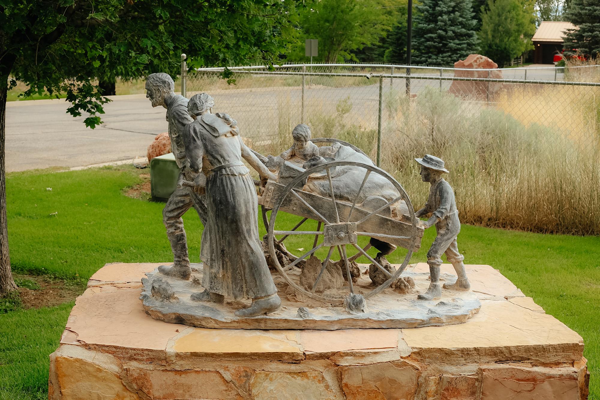 A bronze sculpture depicting Church of Jesus Christ of Latter-day Saints handcart pioneers. The sculpture is atop a stone façade base. The base is estimated to be 25" H, 66" W, 42" D. The affixed sculpture is estimated to be 30" H, 42" W, 26" D. There is attribution for the sculptor. The sculptor, Stanley Watts, was identified through a telephone conversation with the sculptor.
