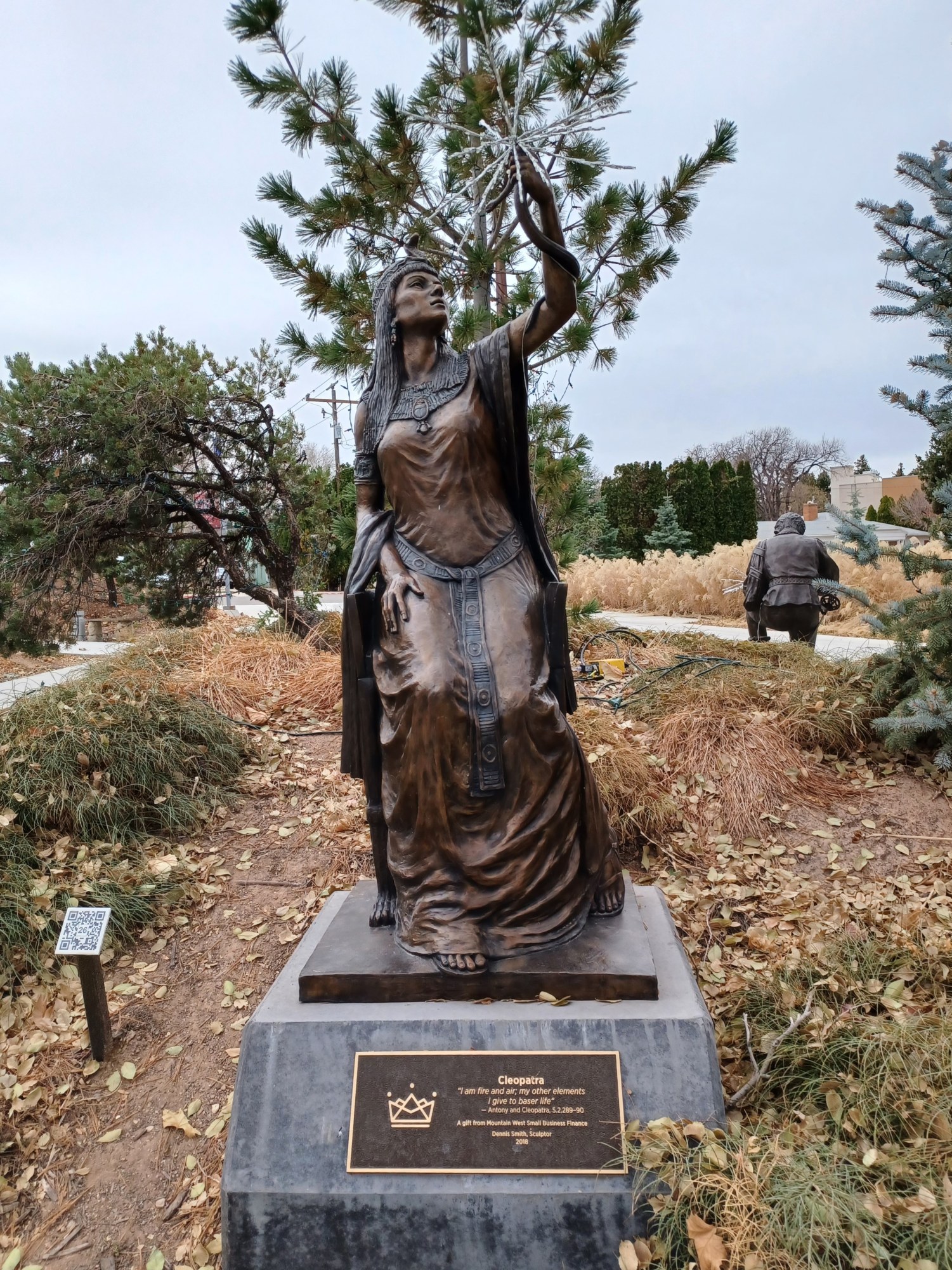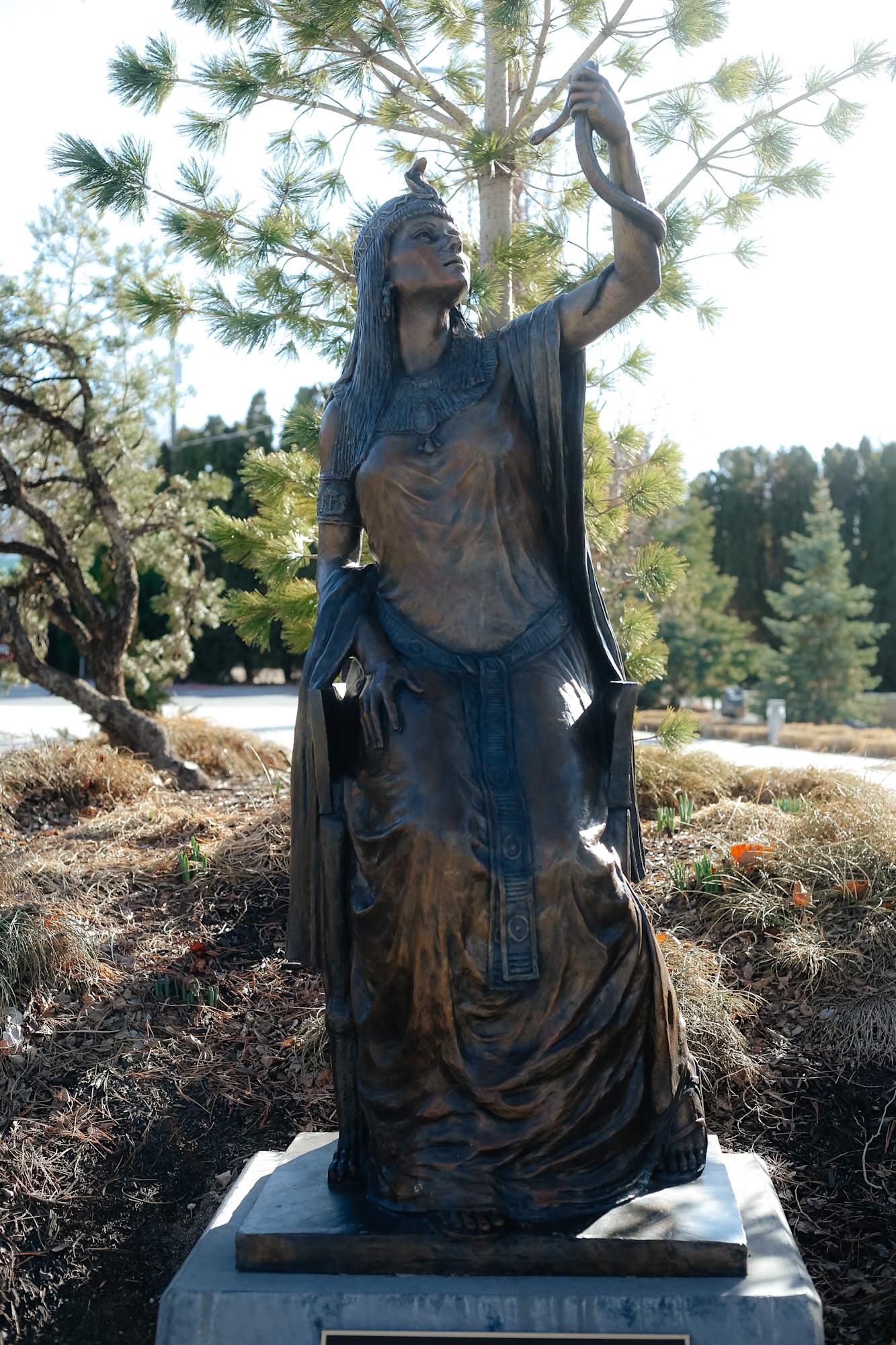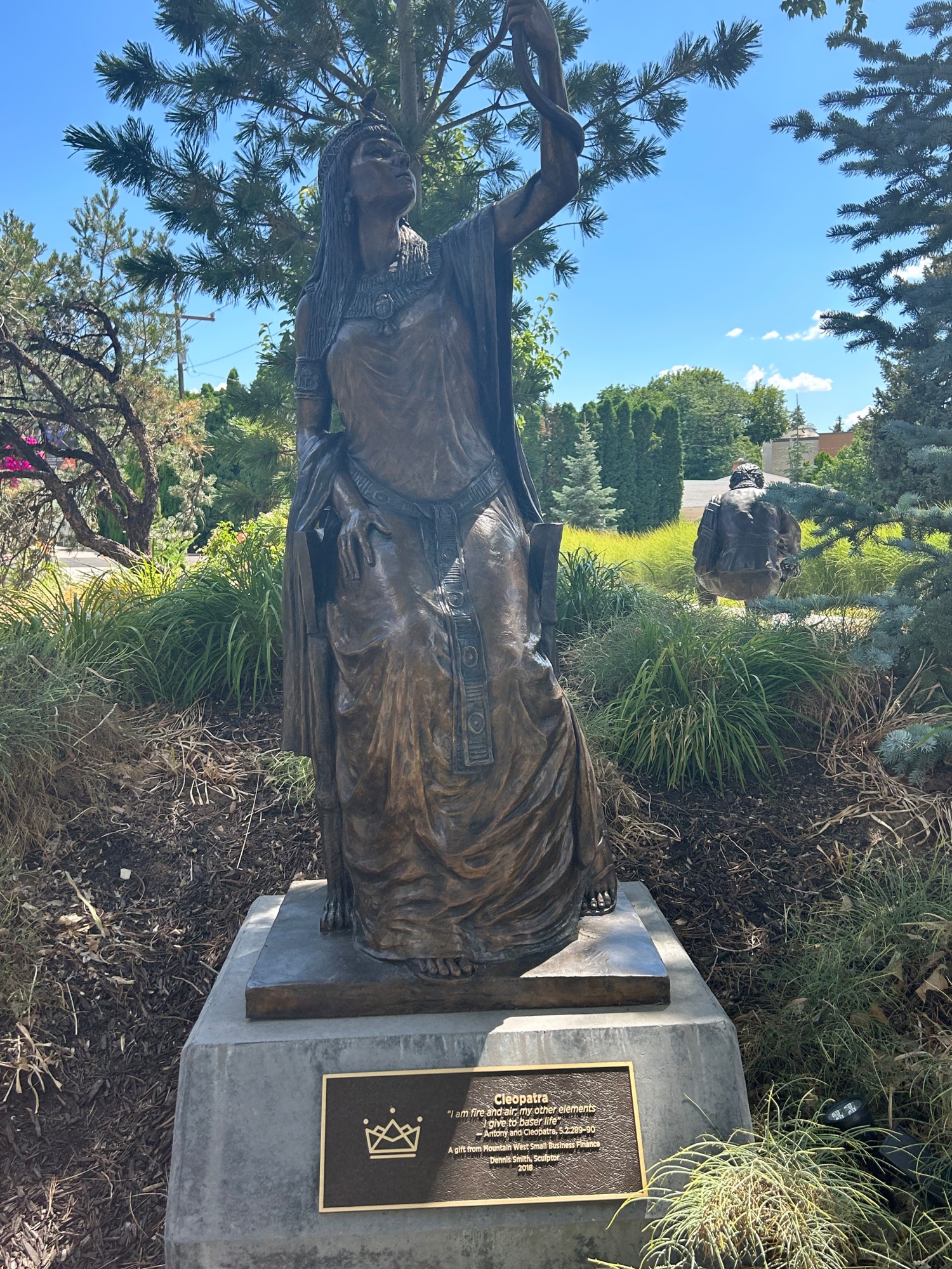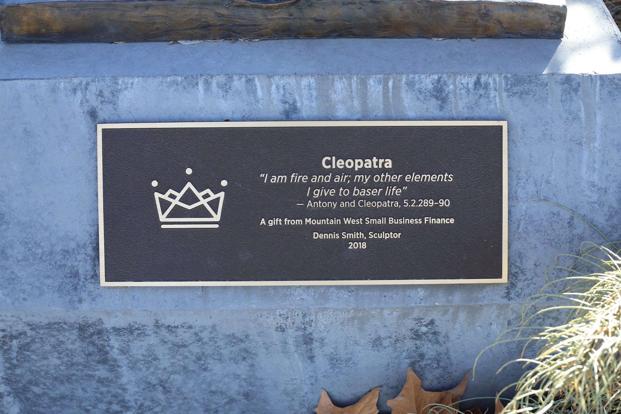 A bronze sculpture of Cleopatra in reference to Shakespeare's "Anthony and Cleopatra." From the attribution plaque: "A gift from Mountain West Small Business Finance." Located in the Catherine and Robert Pedersen Shakespeare Character Garden.