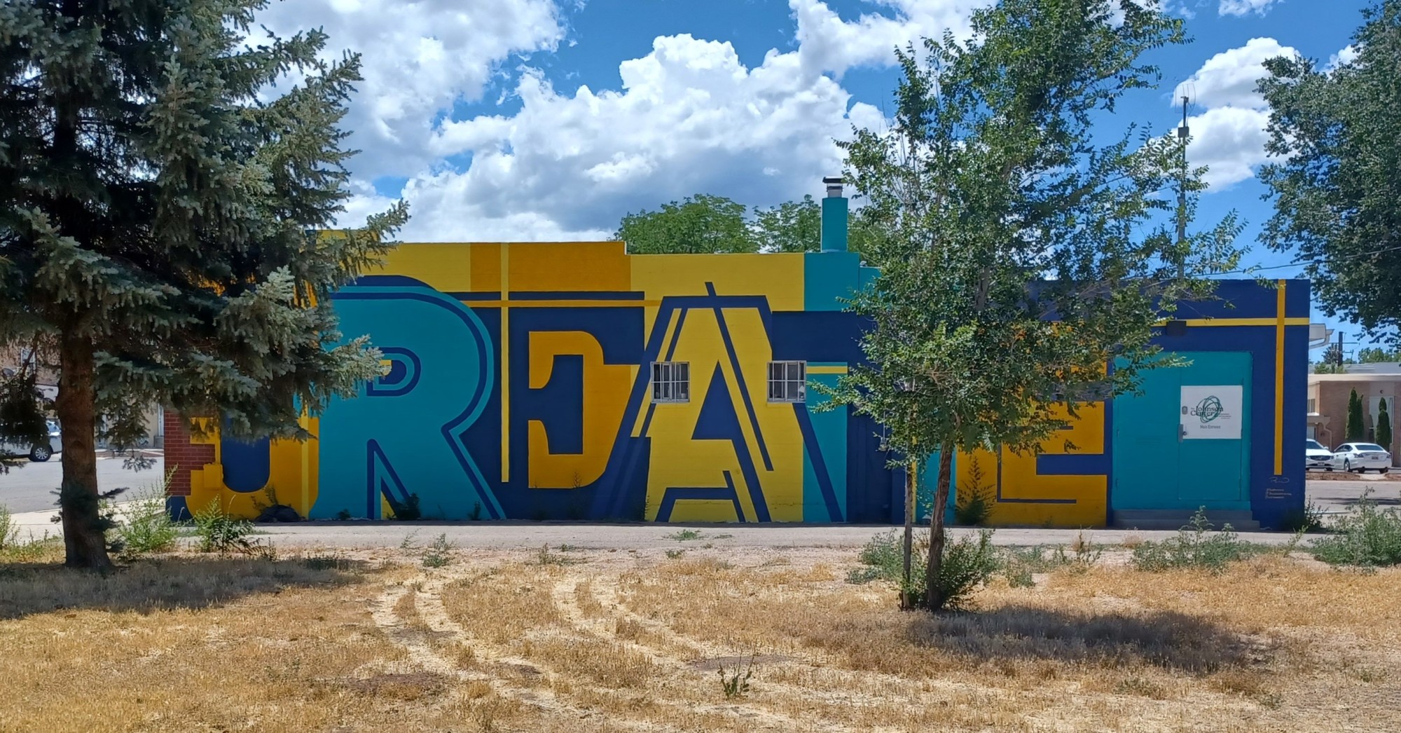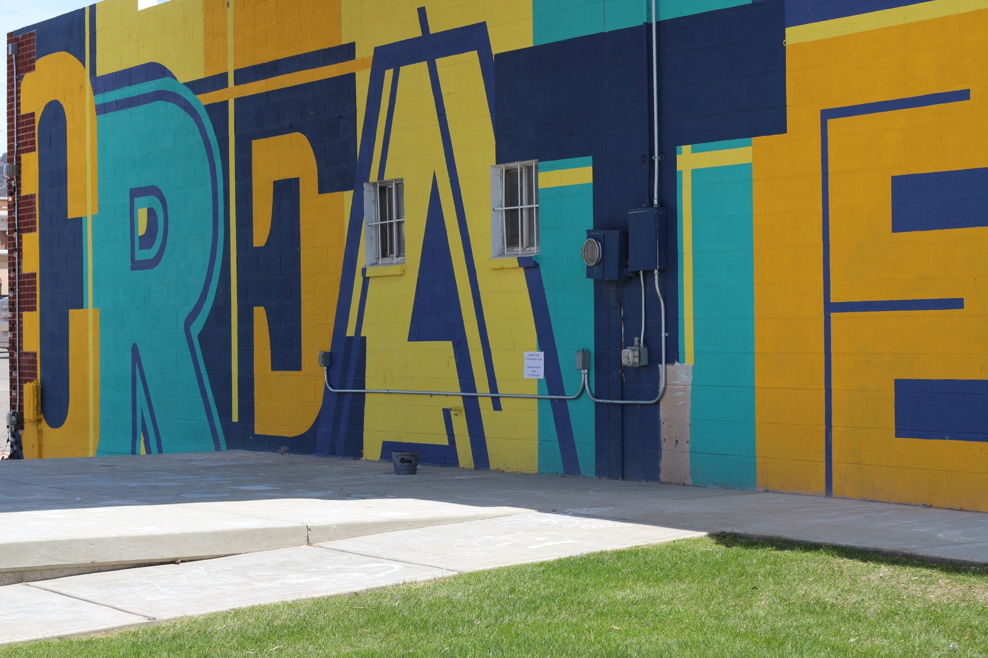 "Create" painted on north side of Johnson Center for Community Arts and Education, 59 N 100 W, Cedar City, UT. The piece represents the creativity that will go on inside the building on which it is painted. In addition, it represents the love which the artist has for Cedar City.