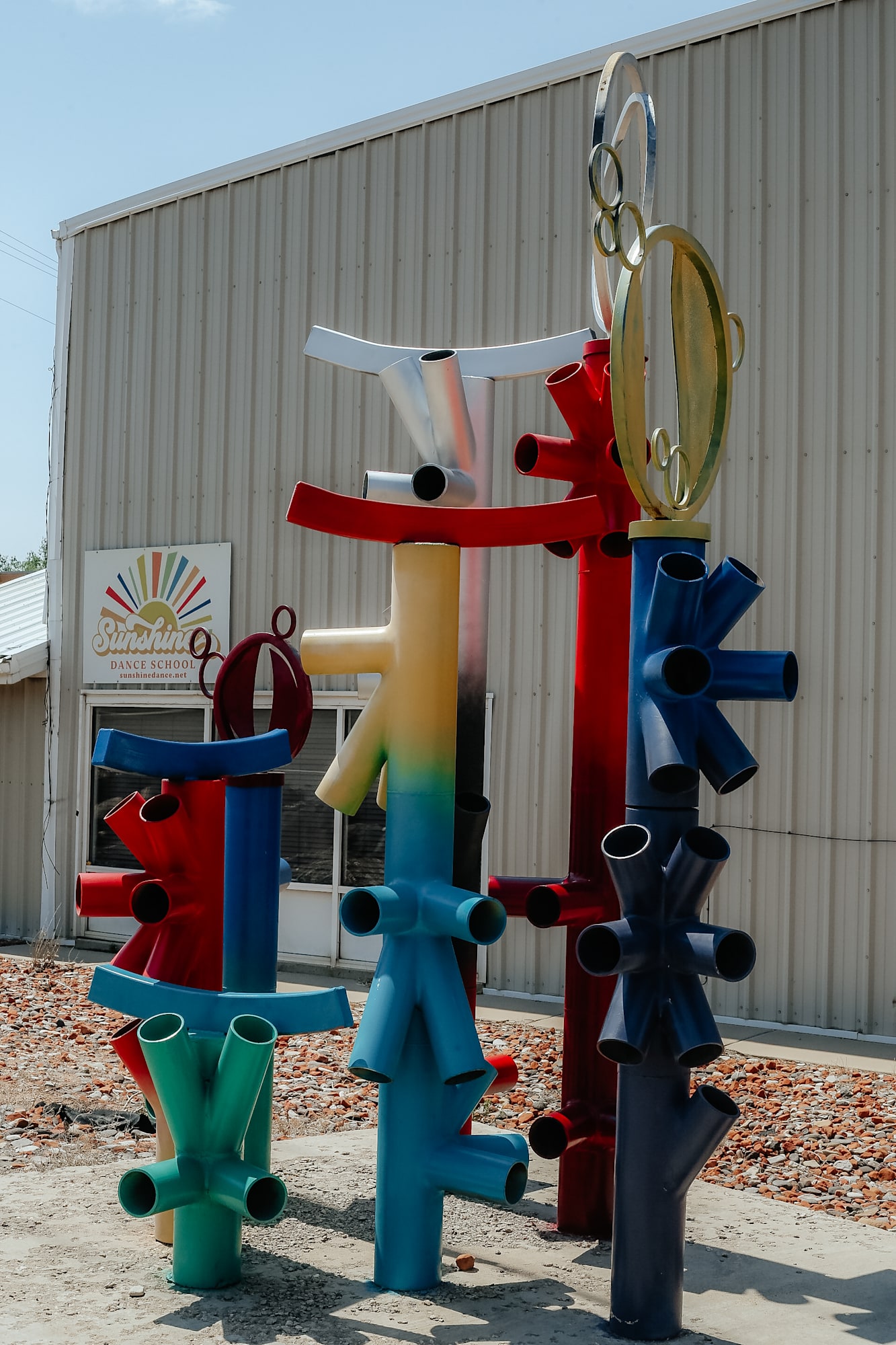 Welded, painted pipe. Commissioned by Lasse Berga, one pipe sculpture represents one member of Lasse's family. There are seven structures. The pipes were seen in a lot on the side of the road in the early 2000's, Lasse's wife got permission from the owner to take them home (they were about to be thrown out) and the family commissioned Jacob Dean to make a sculpture from the metal. Lasse's daughter has repainted it several times over the years