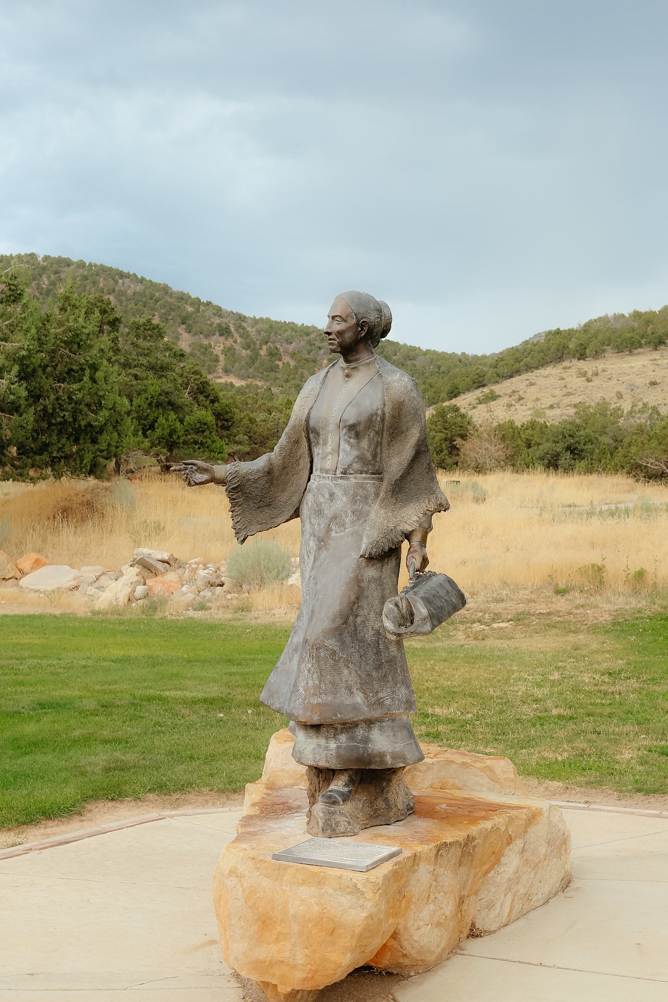 Sculpted by Stanley Q. Johnson (1939-2017). Life-sized bronze sculpture of Paulina Eliza Phelps Lyman ("Aunt Pliny"), Parowan's first doctor and midwife, standing erect with medical bag in hand. Mounted on a single stone base. The site was dedicated on January 13, 2007.
