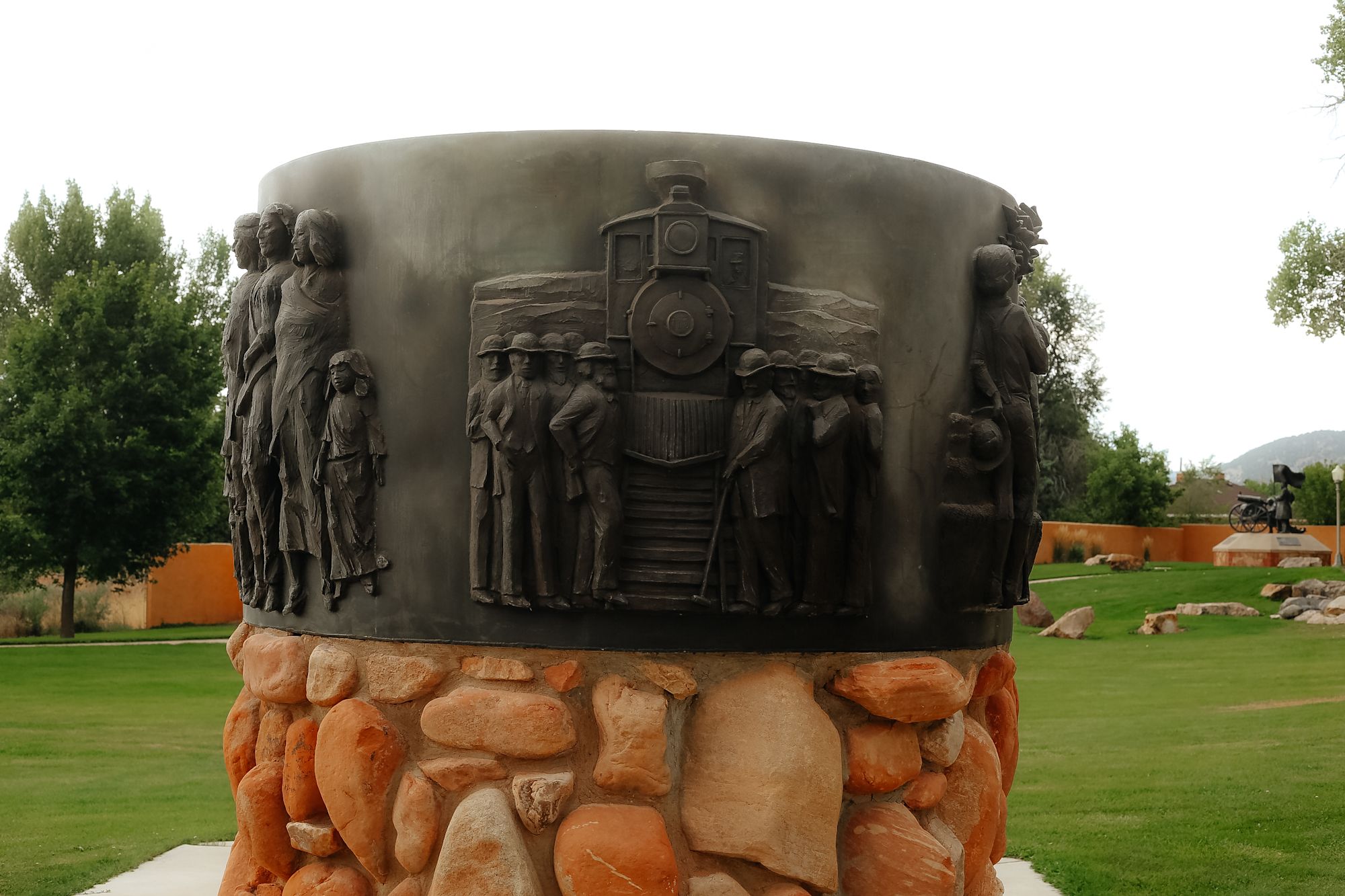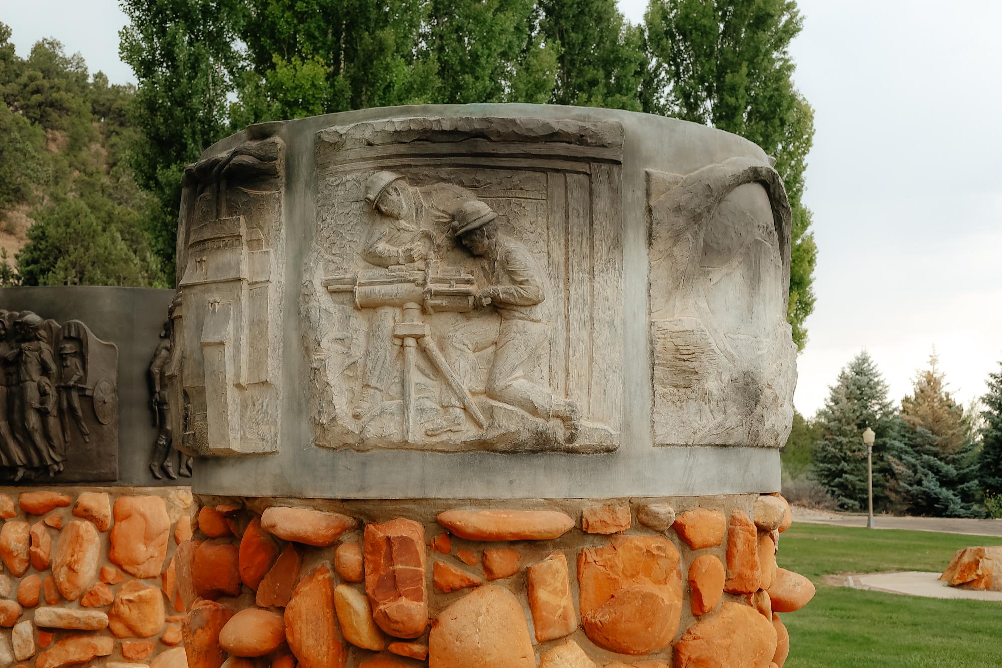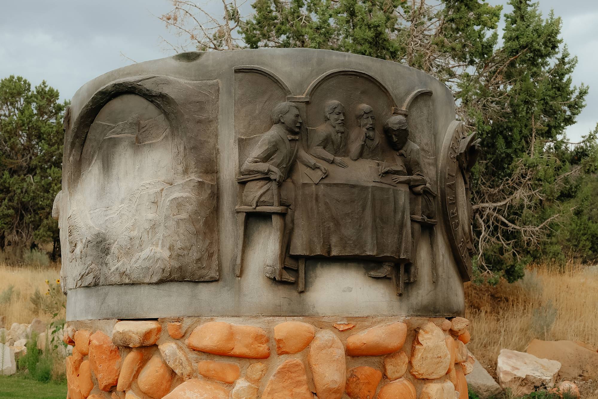 Two Round dioramas honoring the Mormon Pioneers and Utah. Bases and dioramas are estimated to be 7' in diameter. Bases are estimated to be 4.5' high; dioramas are estimated to be 40" high. The base is a stone and mortar façade on a concrete column.