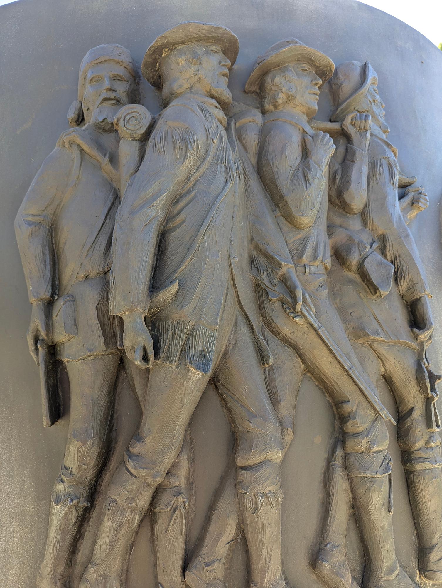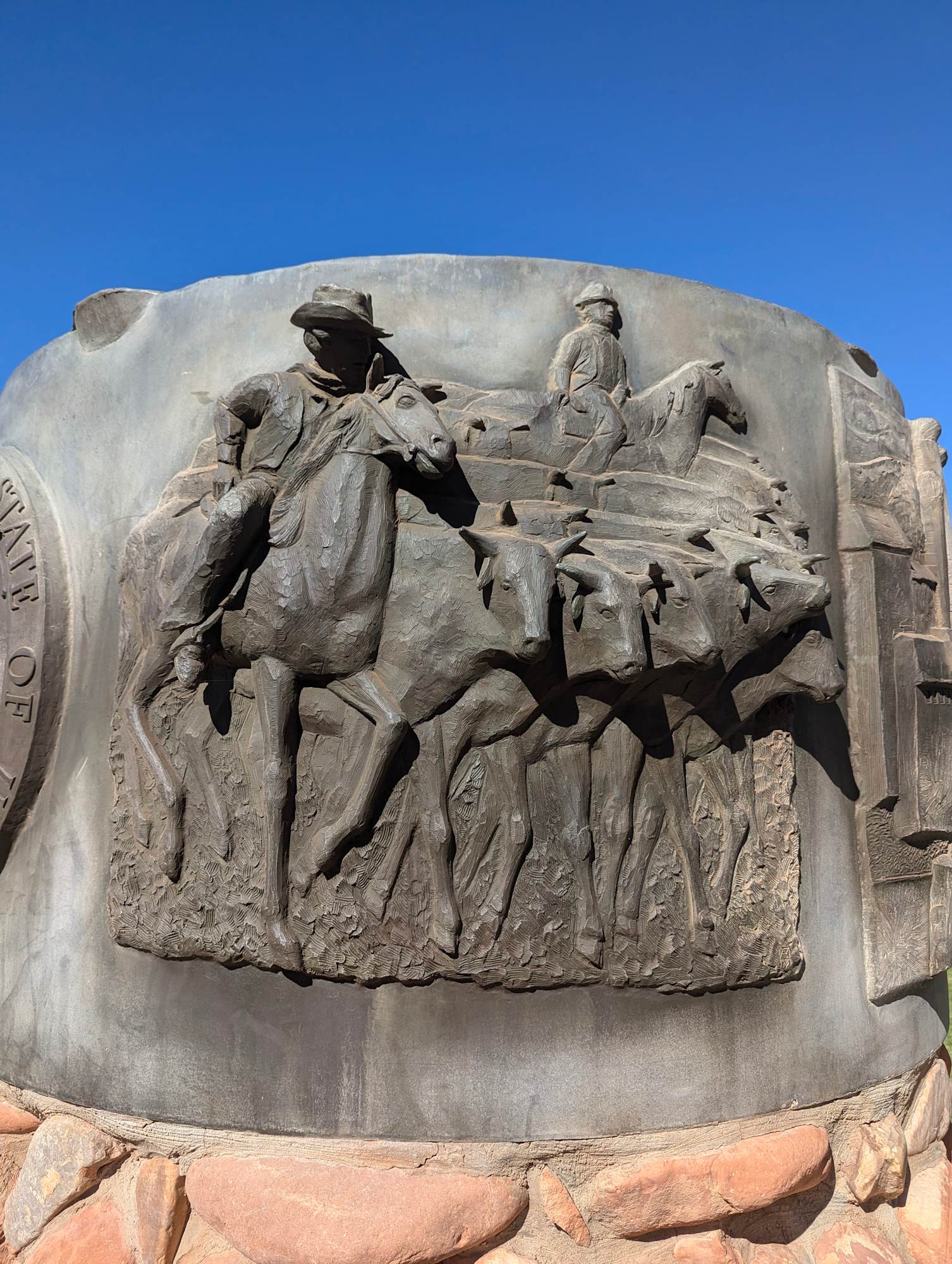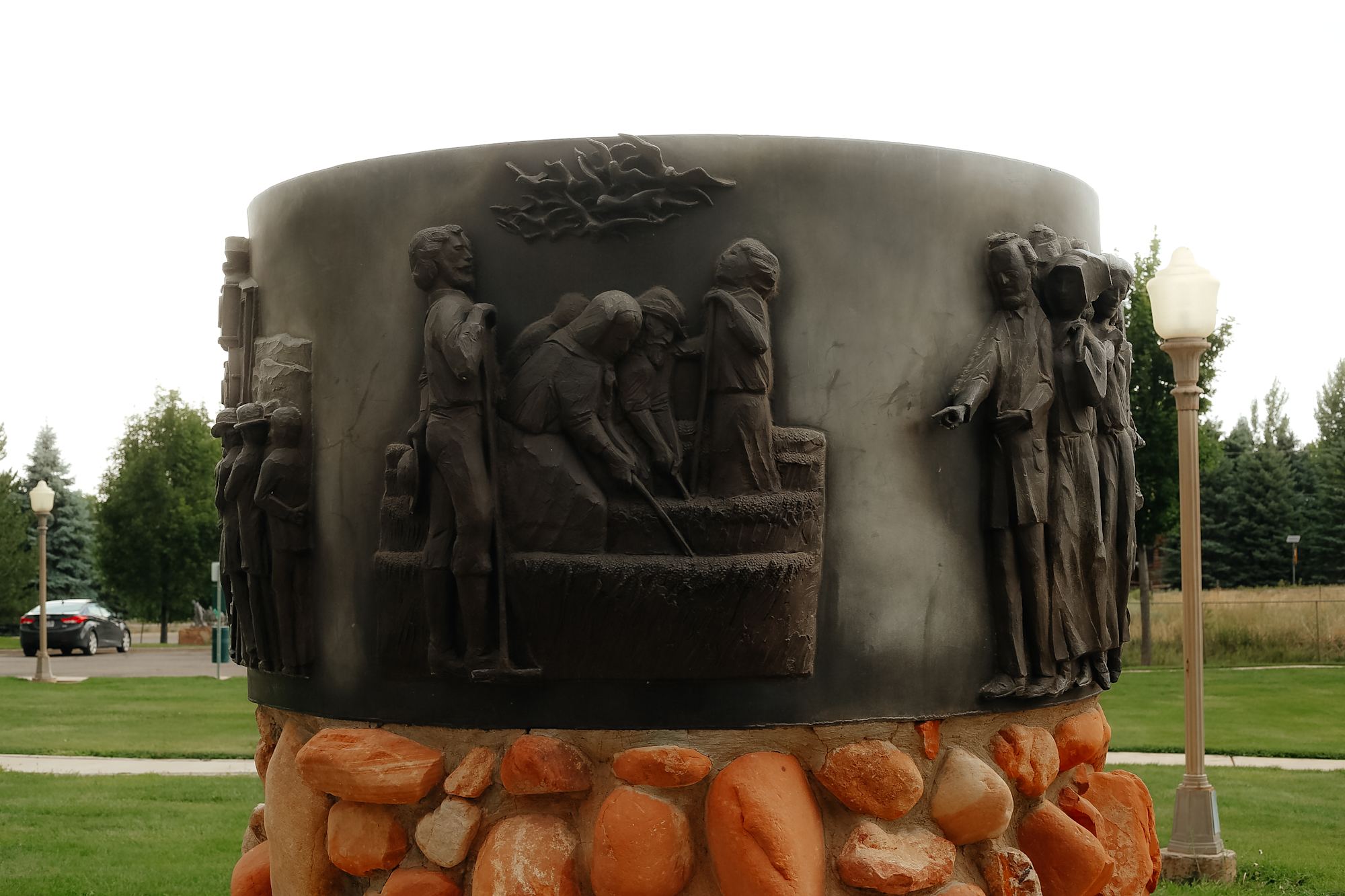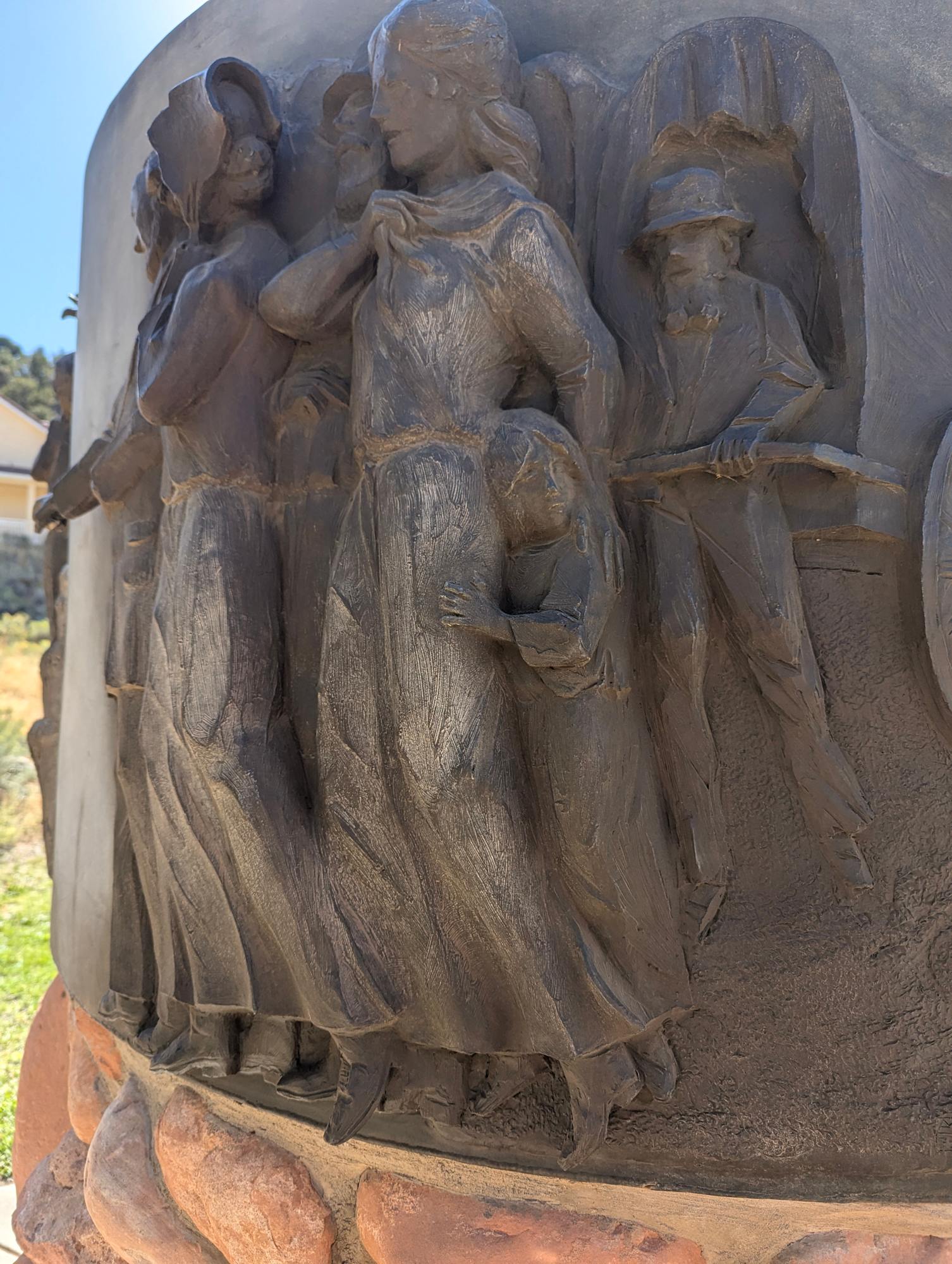 Two Round dioramas honoring the Mormon Pioneers and Utah. Bases and dioramas are estimated to be 7' in diameter. Bases are estimated to be 4.5' high; dioramas are estimated to be 40" high. The base is a stone and mortar façade on a concrete column.