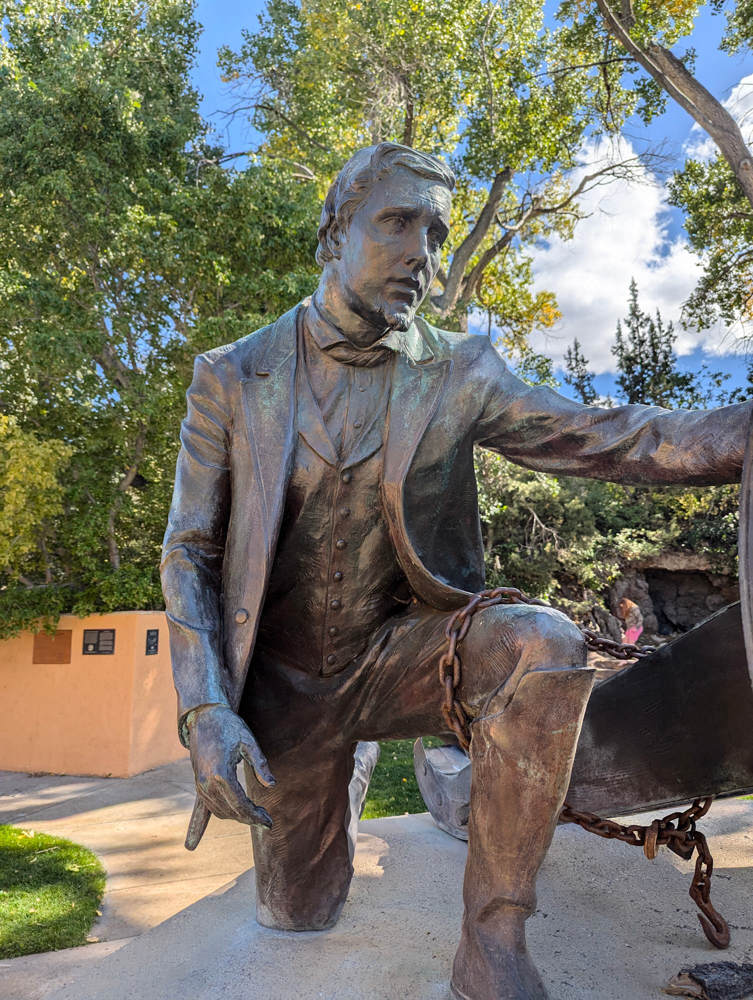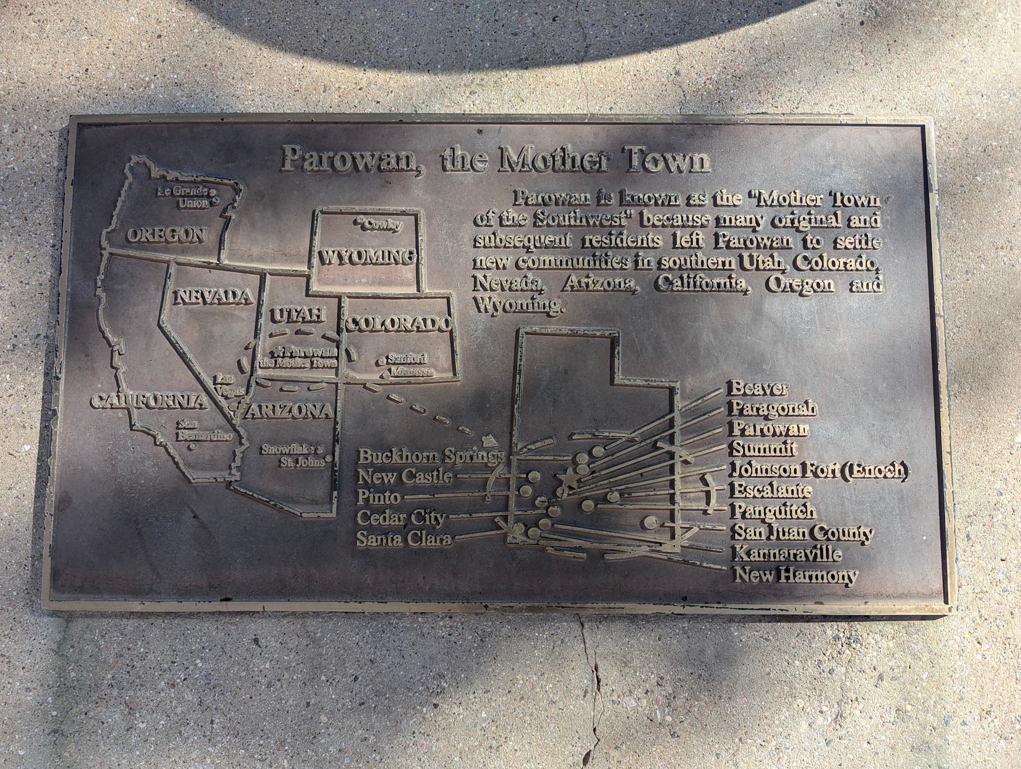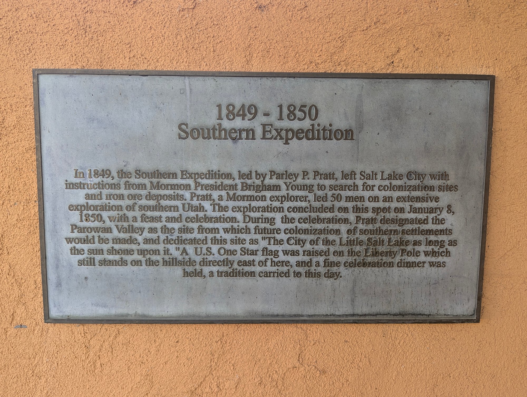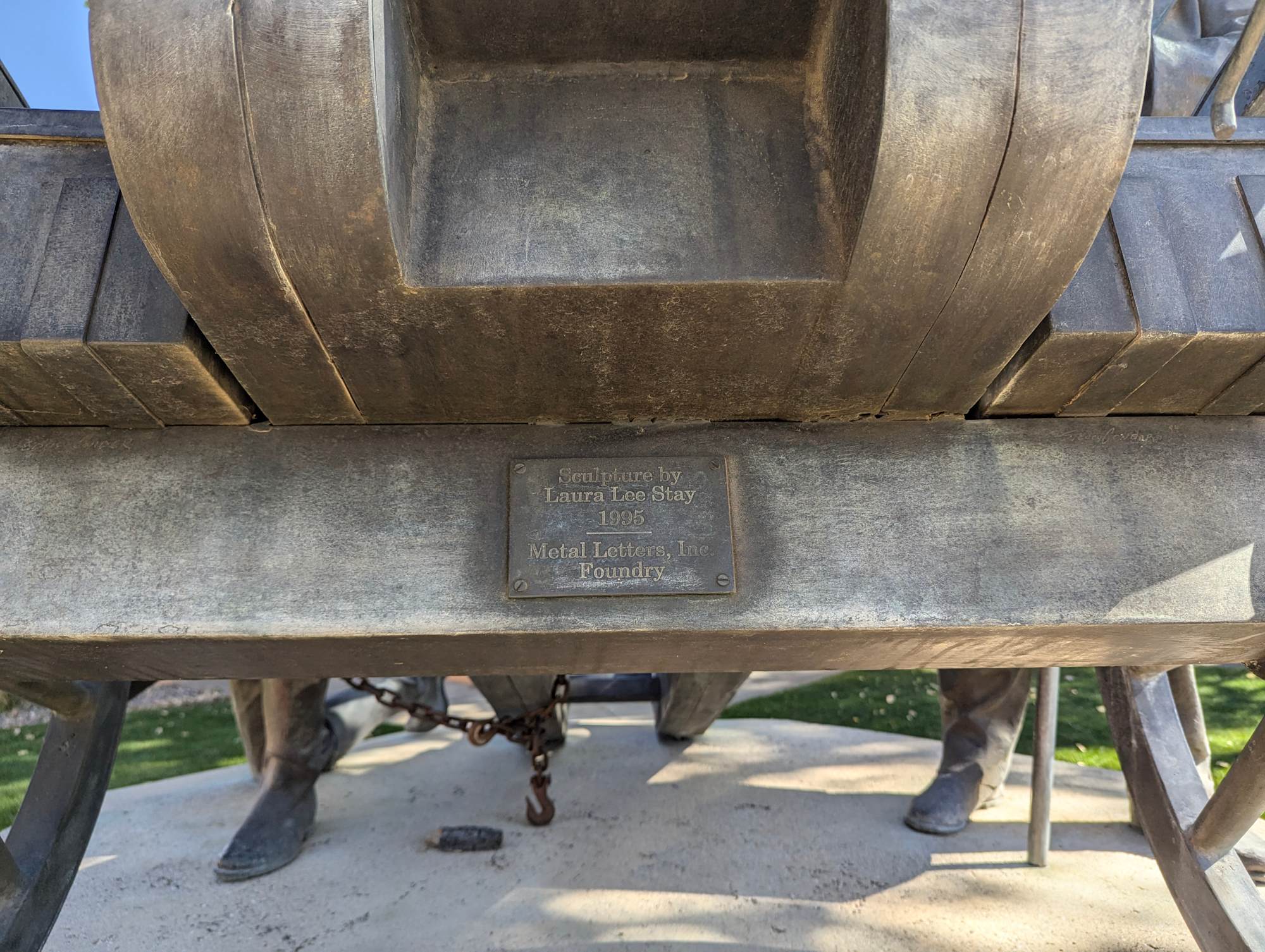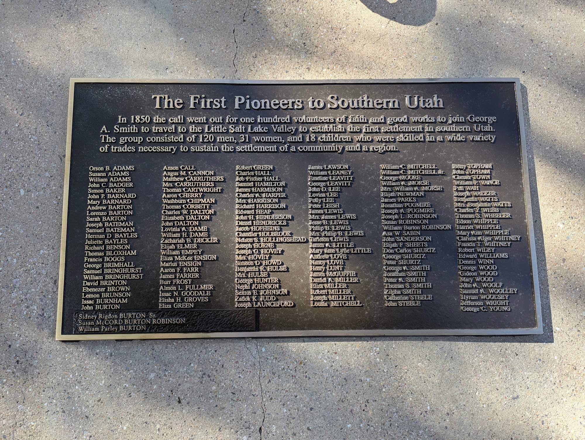 Bronze sculptures on a concrete pedestal with a stone façade. Life-sized representation of founding pioneers George A. Smith (standing with flag) and Jacob Hofhiens (kneeling by cannon), and the "Old Sow Cannon." The cannon was a 6 pounder (fired a 6 pound ball). It was discovered in Daviess County, MO., and brought west with the pioneers. The cannon is now owned by the Church of Jesus Christ of Latter-day Saints.