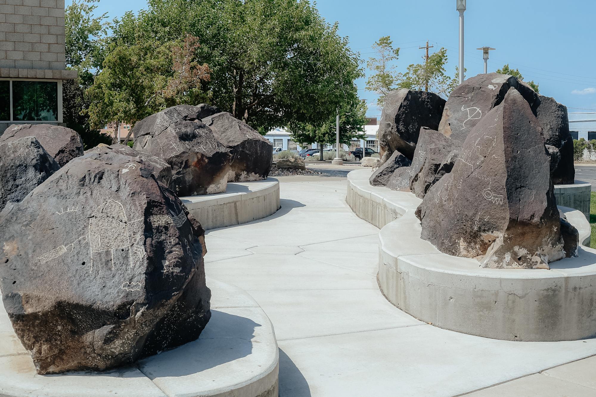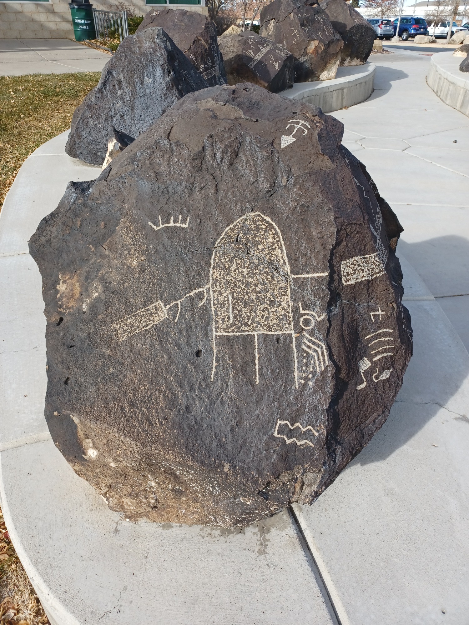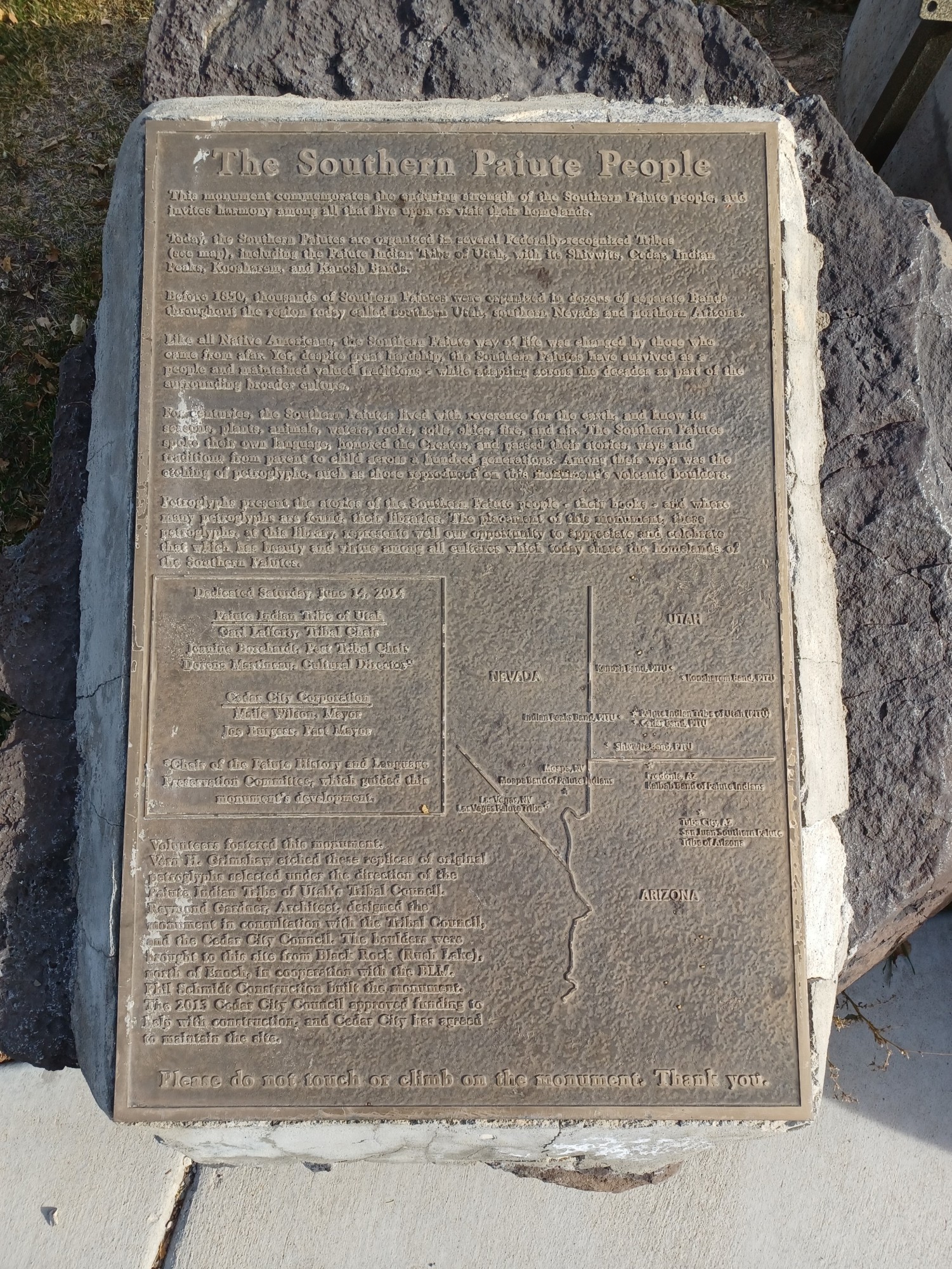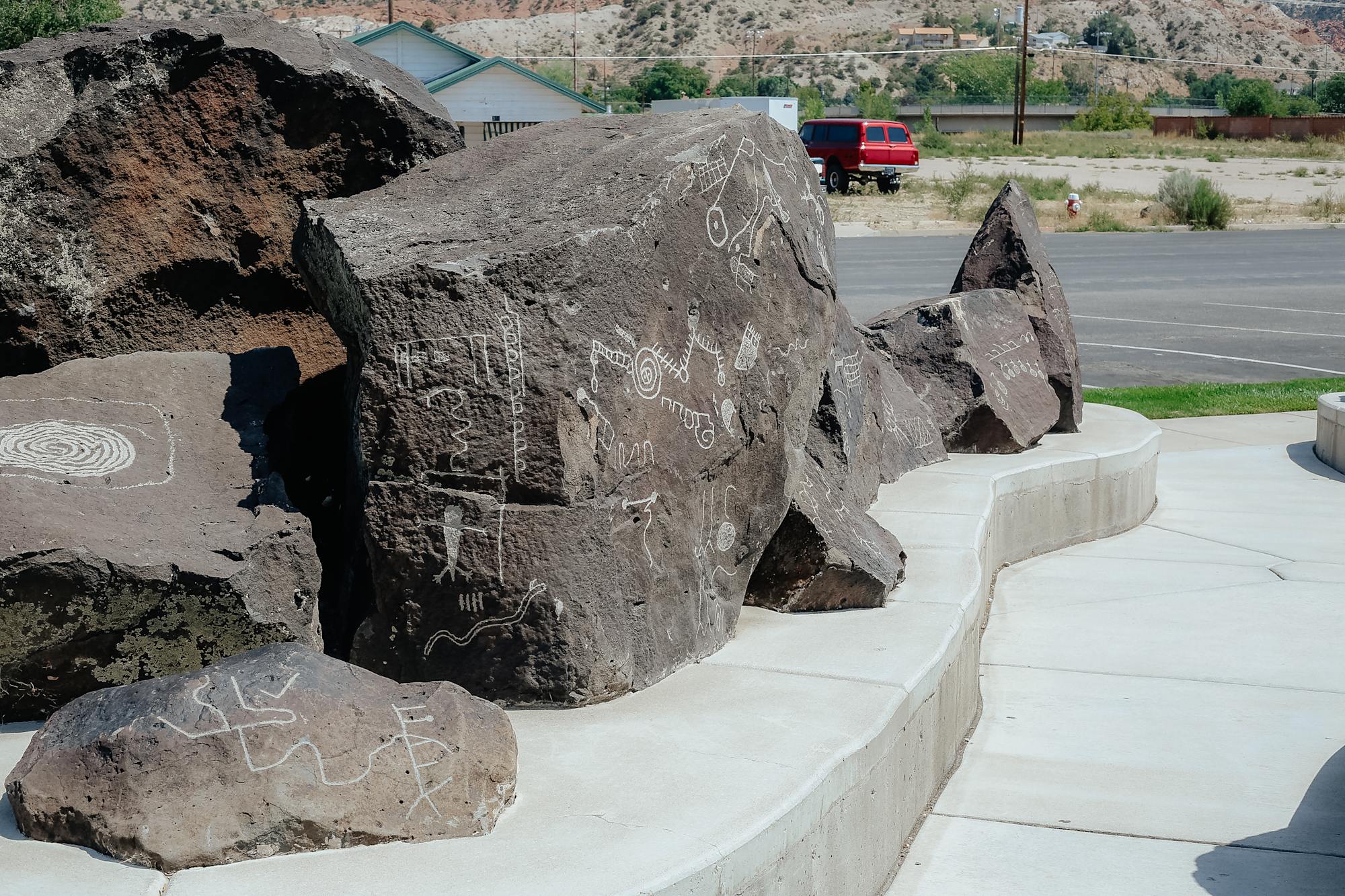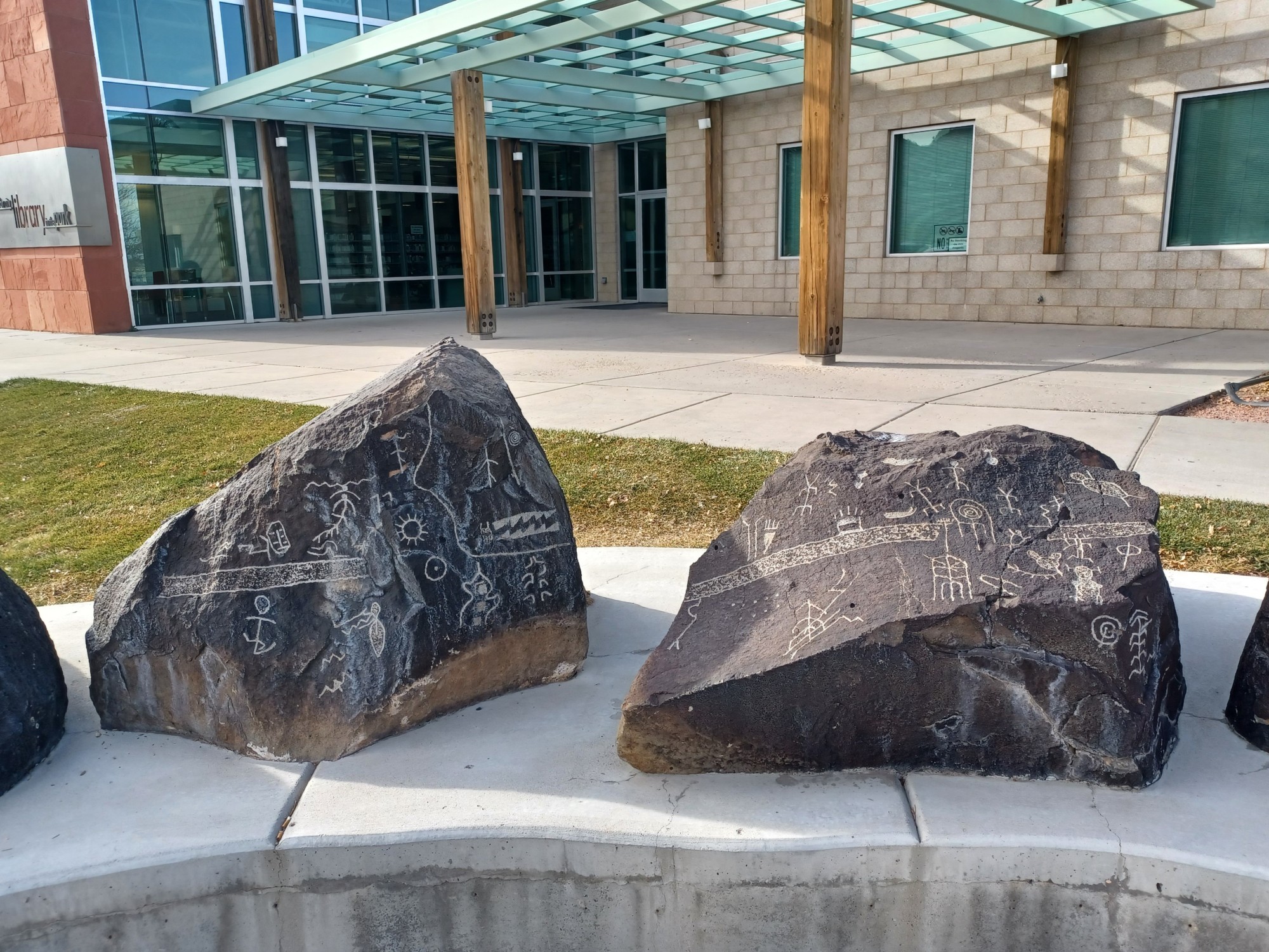 Large boulders etched with images paying tribute to the Southern Paiute people were recreated under the Paiute history and language committee, and then dedicated to the library, tying southern Utah’s rich native history to Cedar City's present. (Source: https://www.upr.org/utah-news/2014-06-17/cedar-city-library-honors-native-tribe).