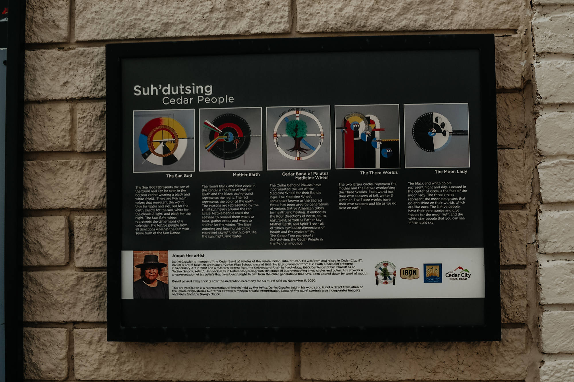 This new addition to downtown Cedar City was unveiled on Veteran’s day 2020. Artist Daniel Growler is a member of the Cedar Band of Paiutes of the Paiute Indian Tribe of Utah and was born and raised in Cedar City. Describing himself as an “Indian Graphic Artist”, he specializes in Native storytelling. The art installation is not a direct translation of the Paiute origin stories but is Growler’s modern artistic interpretation.