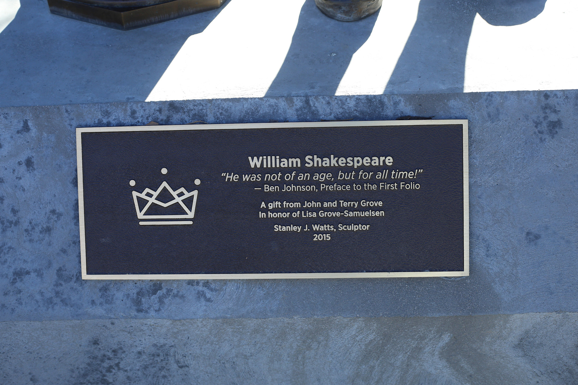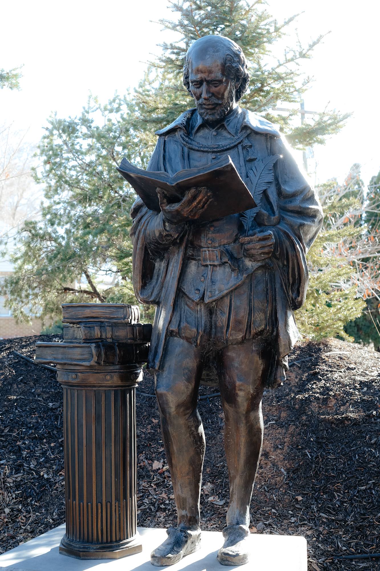 William Shakespeare, bronze. A gift from John and Terry Grove in honor of Lisa Grove-Samuelson. Located in the Catherine and Robert Pedersen Shakespeare Character Garden.