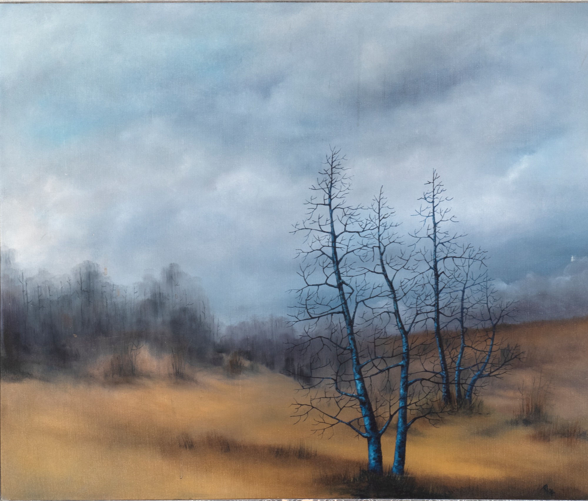 Along Cherry Creek, 1971; painting, landscape in late fall, a group of dark leafless trees growing on in a slight depression covered with brown and rust grasses, black mounded shrubs on the left, dark grey storm clouds in the sky; oil on canvas, 30 x 36; signed lower right, dated verso; silver finish wood frame, 31 x 37. Good condition; scuff in middle right, stains in middle left.
