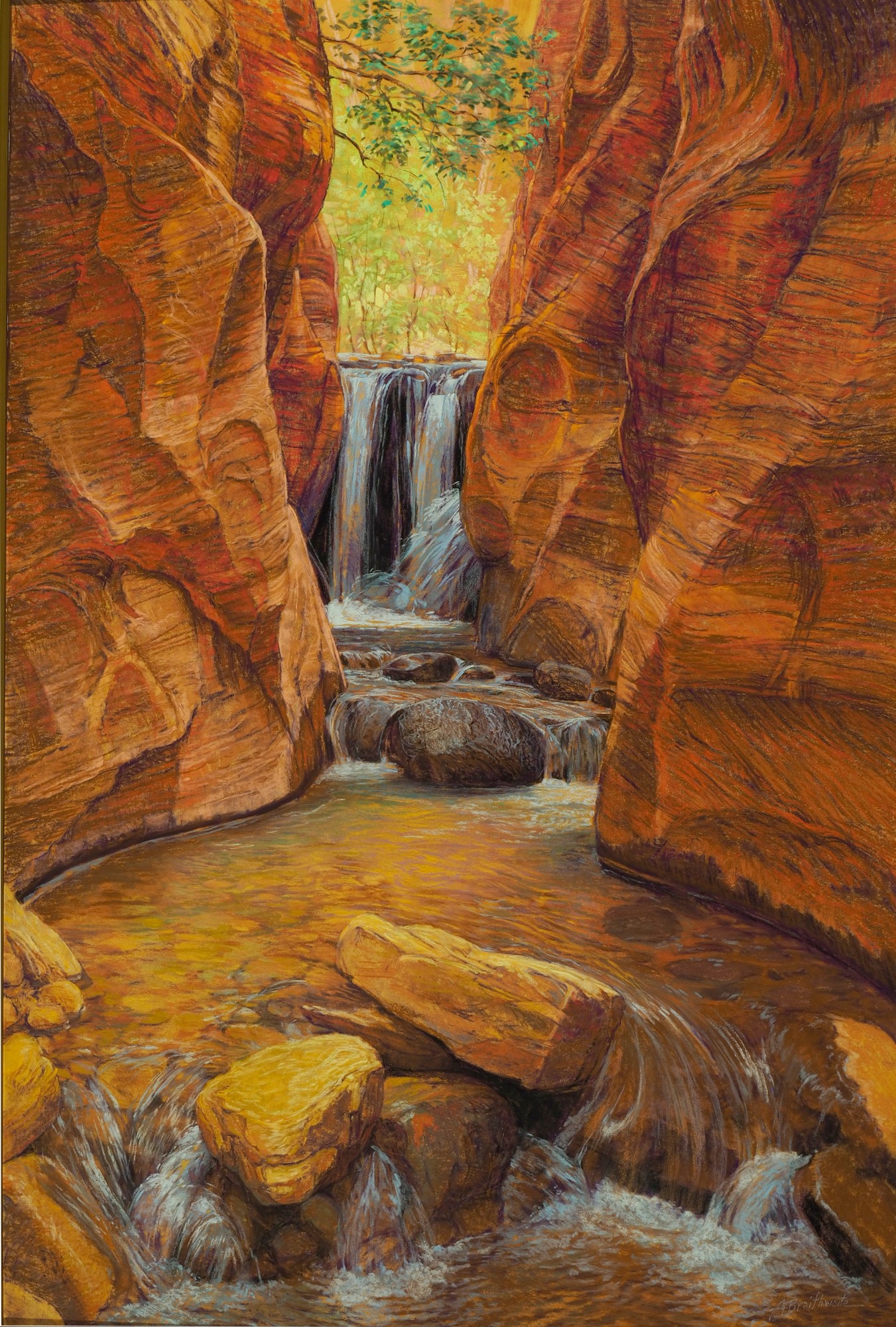 Landscape of Kanarraville Falls. Water, red rock, foliage in the background.