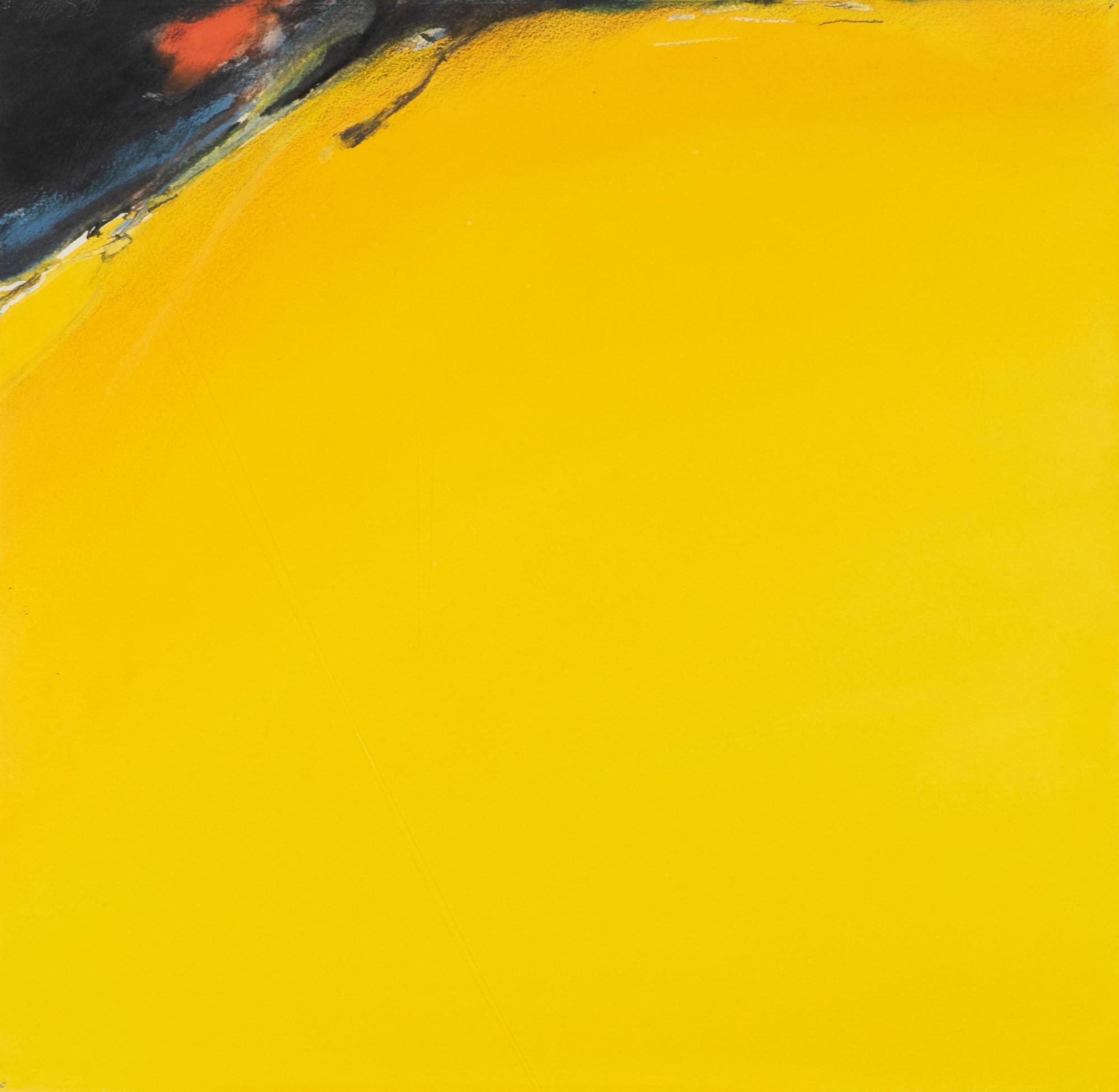 Shoreline with Nuclear Plant, 1978; painting, abstract composition, a vivid yellow covers the whole surface of the composition except the dark upper left corner; gouache on paper, 22 x 22; signed and dated upper left; float mount in silver metal section frame with glass, 30 x 28. Very good condition.
