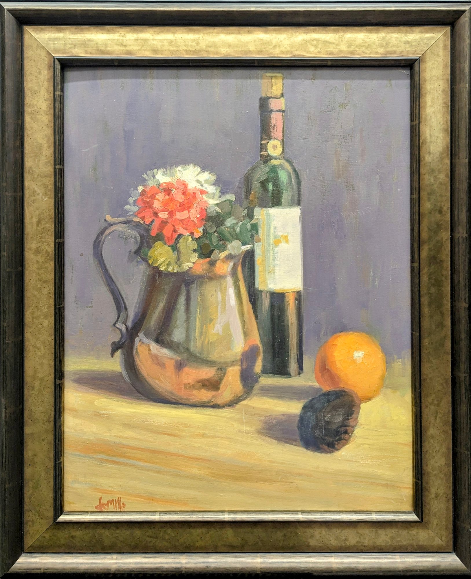 - Subject Matter: A still life of a pitcher with flowers, some fruit and a wine bottle