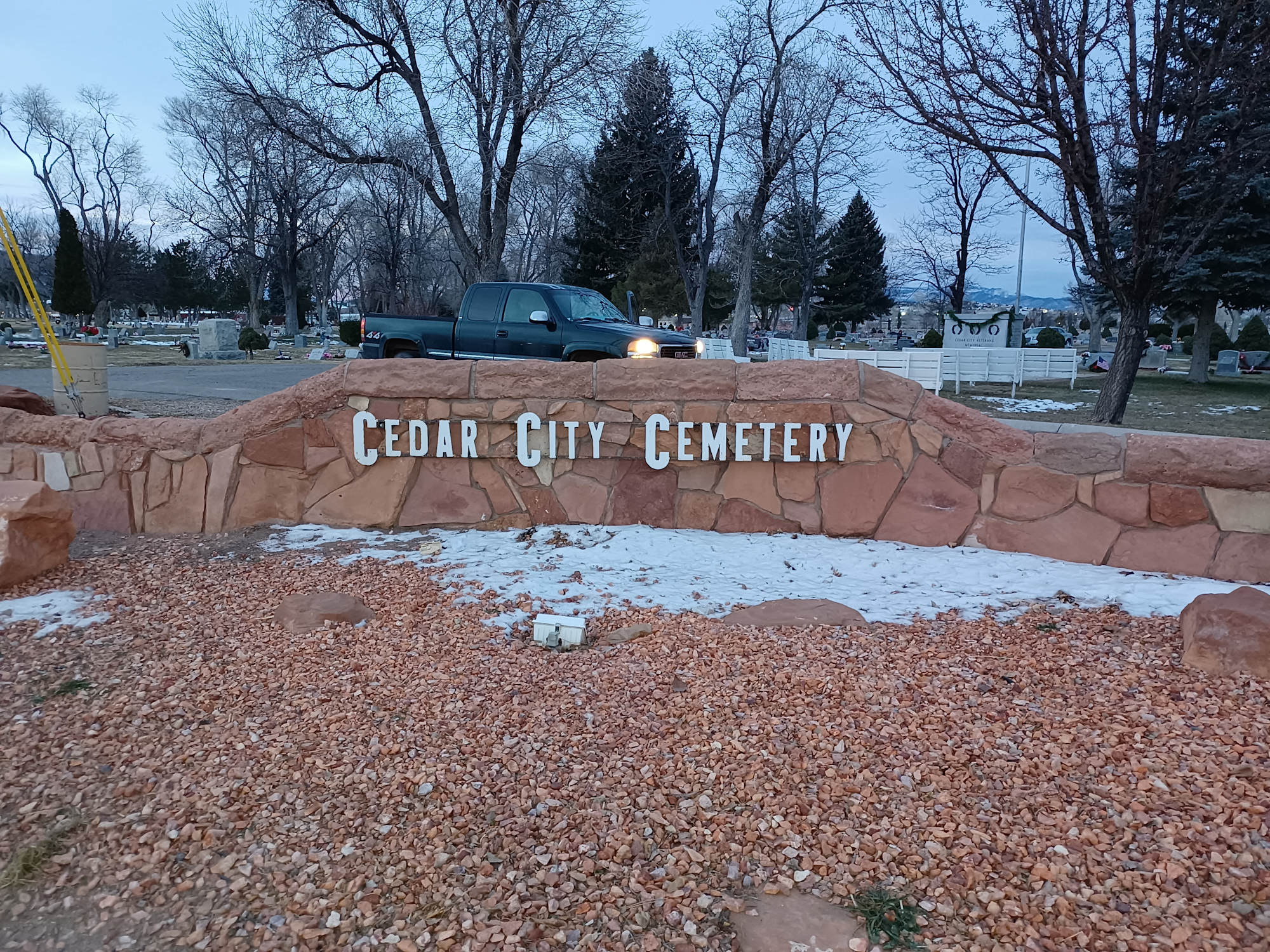 Cedar City Cemetery, 685 North Main Street, Cedar City. Historical Significance. The original wall was built in 1886. The monument is stone or stone façade with a metal information plaque. From the information plaque: "Cedar City Historic Pioneer Cemetery Wall[:] The reconstruction of the historic pioneer cemetery was completed in August 1994 as a memorial to the stalwart Mormon pioneers who settled this part of the American West and who originally built and dedicated the wall in the year 1886. It was rededicated to their memory on August 9, 1994." The wall has undergone many repairs since its reconstruction. The monument is located near the center of the cemetery.