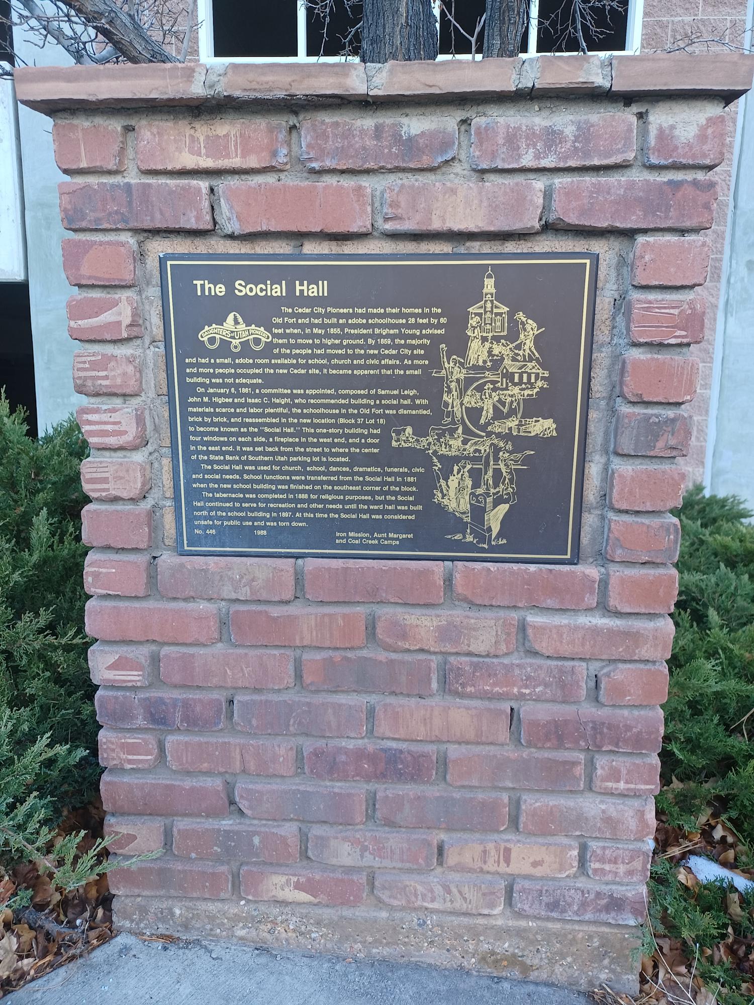 Daughters of Utah Pioneers marker, 446. Metal plaque set into brick monument. From the inscription: "On January 6, 1881, a committee was appointed...who recommended building a social hall. With materials scarce and labor plentiful, the schoolhouse in the old Fort was dismantled, brick by brick, and reassembled at the new location to become known as the 'Social Hall"...The Social Hall was used for church, school, dances, dramatics, funerals, civic and social needs. No. 446. 1988. Iron Mission, Aunt Margaret and Coal Creek Camps."