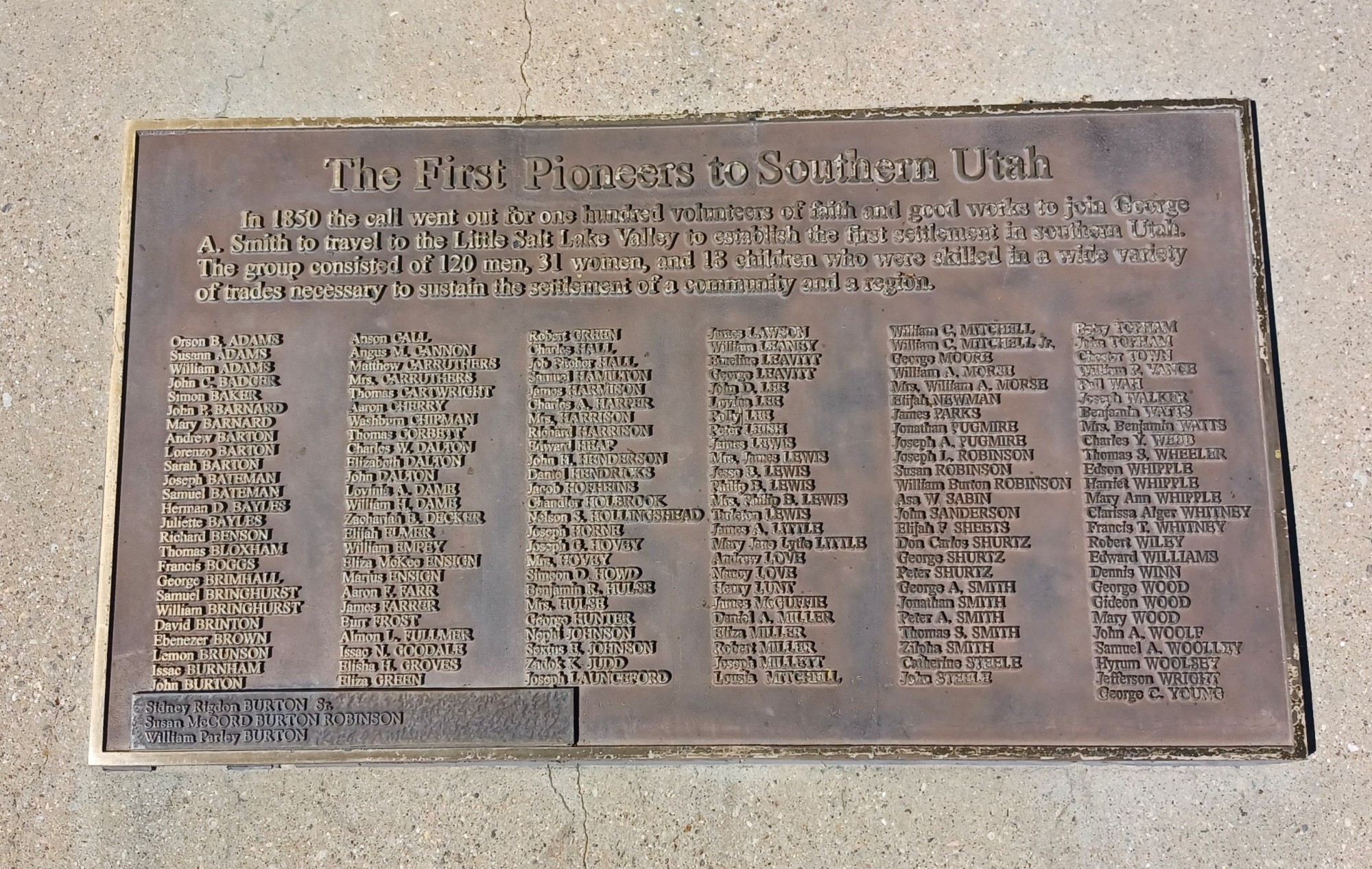 Bronze sculptures on a concrete pedestal with a stone façade. Life-sized representation of founding pioneers George A. Smith (standing with flag) and Jacob Hofhiens (kneeling by cannon), and the "Old Sow Cannon." The cannon was a 6 pounder (fired a 6 pound ball). It was discovered in Daviess County, MO., and brought west with the pioneers. The cannon is now owned by the Church of Jesus Christ of Latter-day Saints.