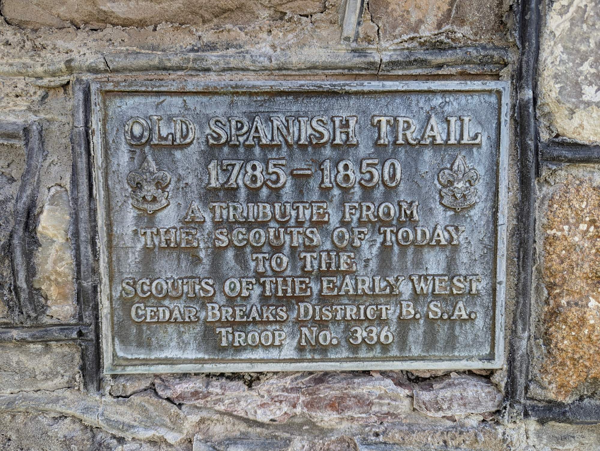 Spanish Trail Monument, Enoch. Metal and object on stone façade over concrete base. Inscription: "Old Spanish Trail 1785-1850. A tribute from the scouts of today to the scouts of the early west. Cedar Breaks District B.S.A. Troop No. 336"