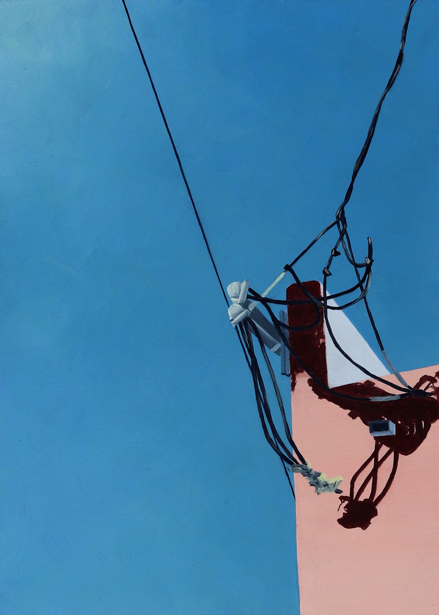 The series explores the idea of shifting perspective – literally and figuratively. Each painting looks upwards, capturing an expanse of sky with a sliver of a building in view, keeping the viewer grounded on earth.