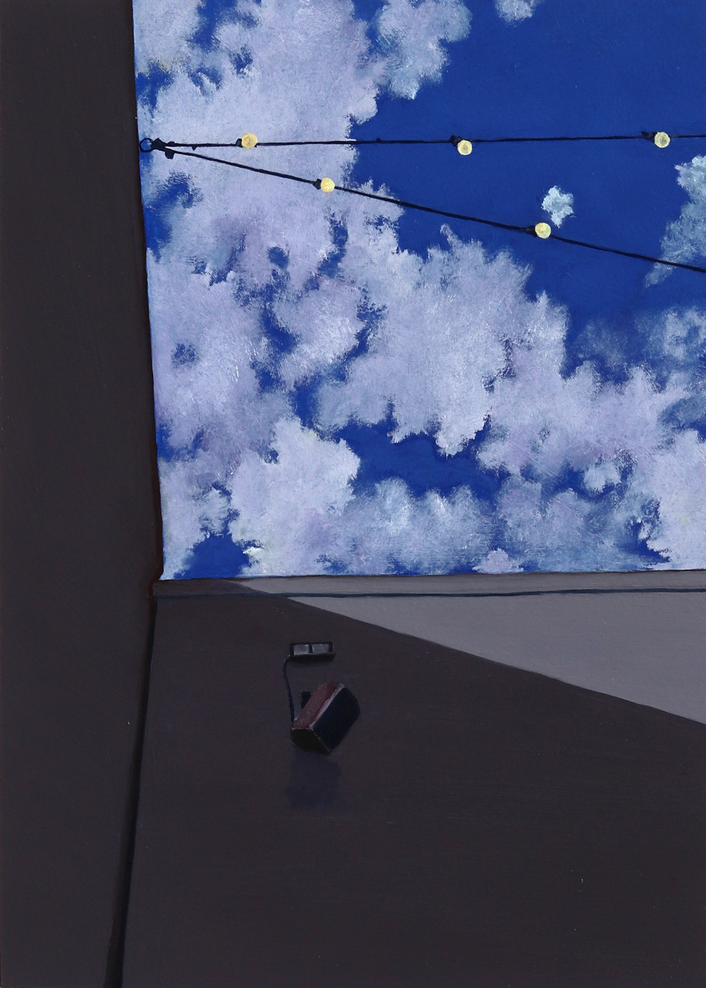 The series explores the idea of shifting perspective – literally and figuratively. Each painting looks upwards, capturing an expanse of sky with a sliver of a building in view, keeping the viewer grounded on earth.
