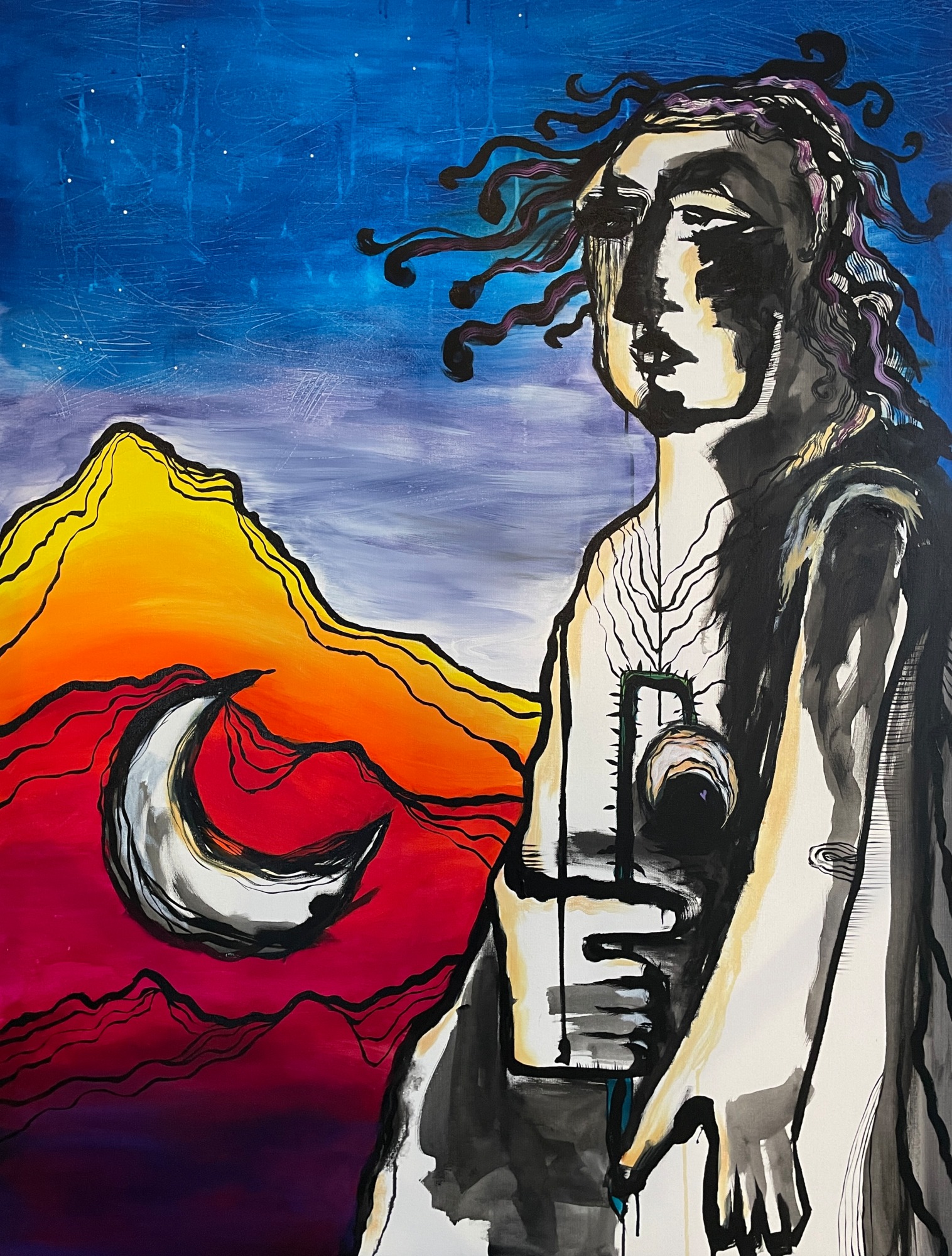 My current body of work utilizes acrylic, ink, paper, tempera, stencils, and collage to create a sense of texture and contrast. I work in bold, vibrant colors, often blending directly on the canvas, sometimes pushing, washing, or dripping medium, or pollinating my brushes with different paint colors. I frequently integrate paper, either as part of a canvas, or as torn pieces placed in ways that create or highlight the figures in my work.