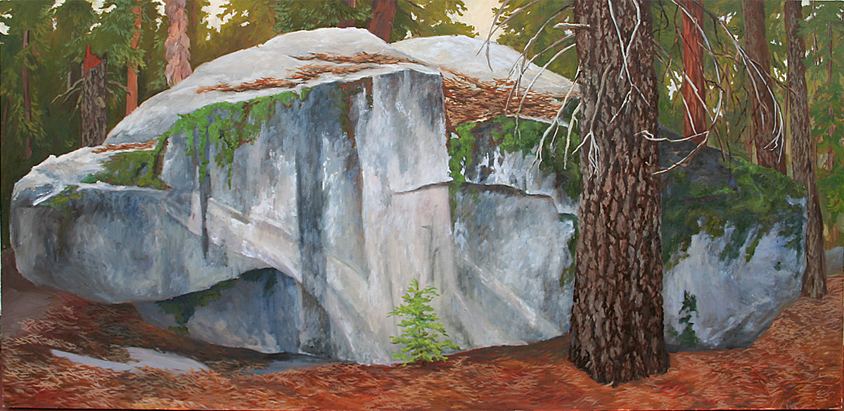 People assume this painting originates in Yosemite; but huge erratic boulders are found in many spots in the Sierra. On a hushed, slate gray day at Grouse Meadow I took a rest and ate lunch in the company of this boulder. I got to thinking about all the seasons this rock has endured, ever so slowly changed by time. How and when did it get to this spot? That tree next to it has had a long life, but just a blink of an eye to the rock. And now a new sapling sprouts... If this boulder could speak to us, what tales would it tell?